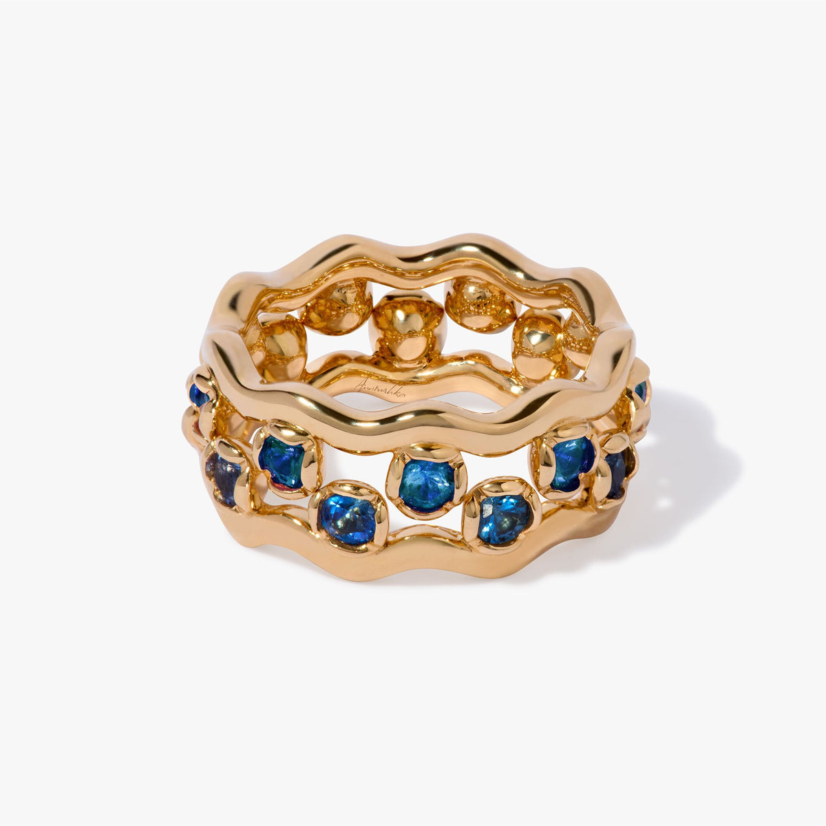 This Whoopsie Daisy Sapphire Ring Stack by Annoushka brings a brilliant twist to the classic daisy motif. Featuring two interlocking rings in 18k yellow gold, each set with vivid blue sapphires, the stack evokes joy and artistry in motion. Wear it solo or mixed with other gold stacking bands for a richly textured look.