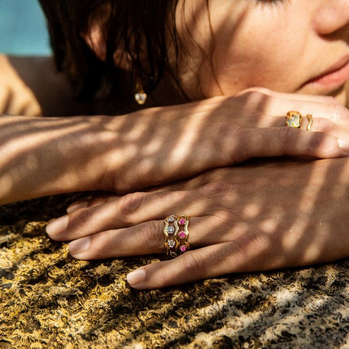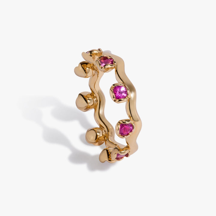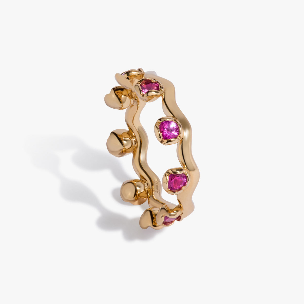 Handcrafted in 18k yellow gold with pink sapphires. Wavy eternity band design.