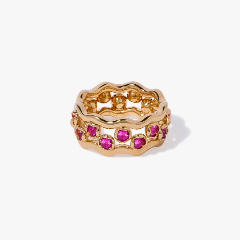 This Whoopsie Daisy Sapphire Ring Stack by Annoushka is a joyful expression of natural form and color. Two interlacing pink sapphire eternity rings, crafted with a signature wavy silhouette, reflect the brand’s playful interpretation of a daisy chain. Symbolising love and feminine grace, this stack is ideal for layering or wearing as a radiant standalone duo.