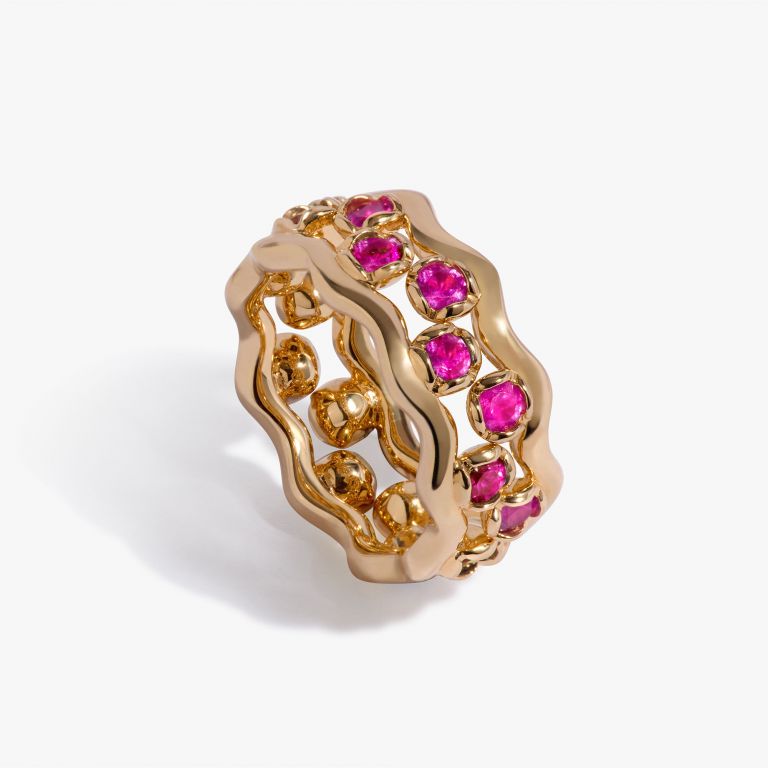 Handcrafted in 18k yellow gold with pink sapphires. Includes two interlacing eternity rings in signature wave design.