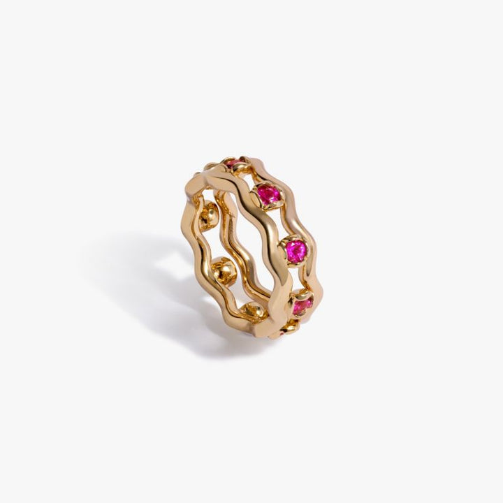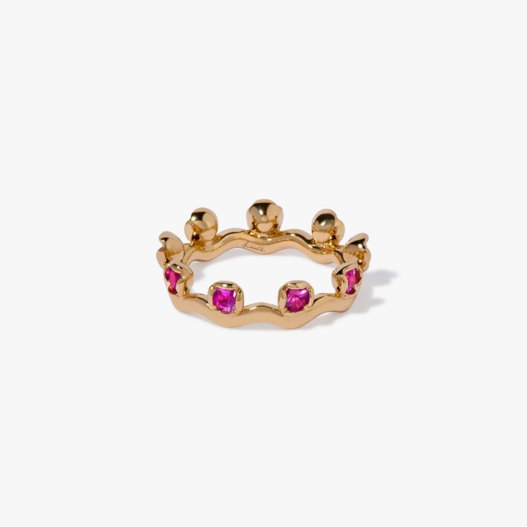 Handcrafted in 18k yellow gold with pink sapphire and ruby accents. Includes a 2mm band and signature organic cup setting.
