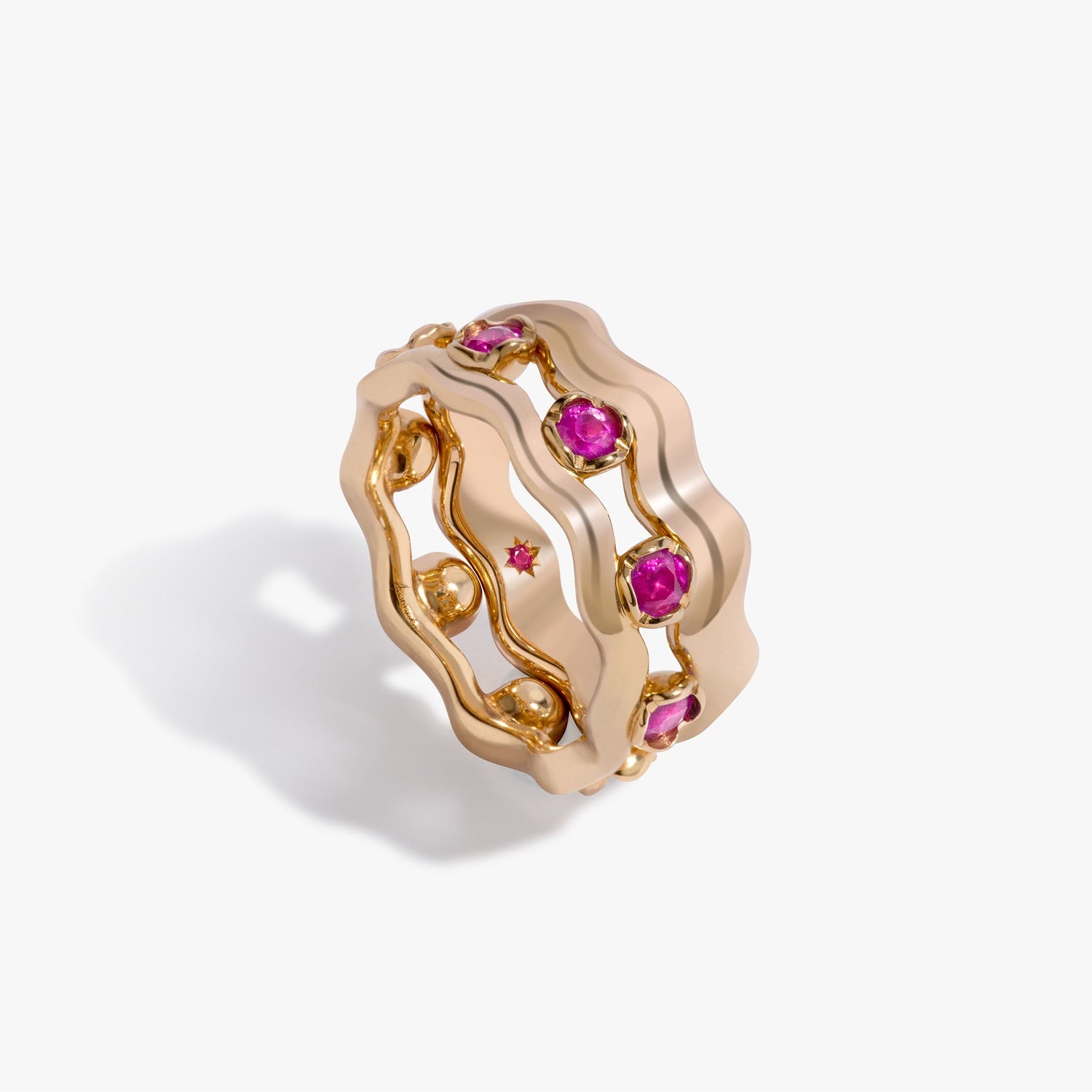 Handcrafted in 18k yellow gold with pink sapphire and ruby accents. Includes a 4mm band with signature organic cup setting.