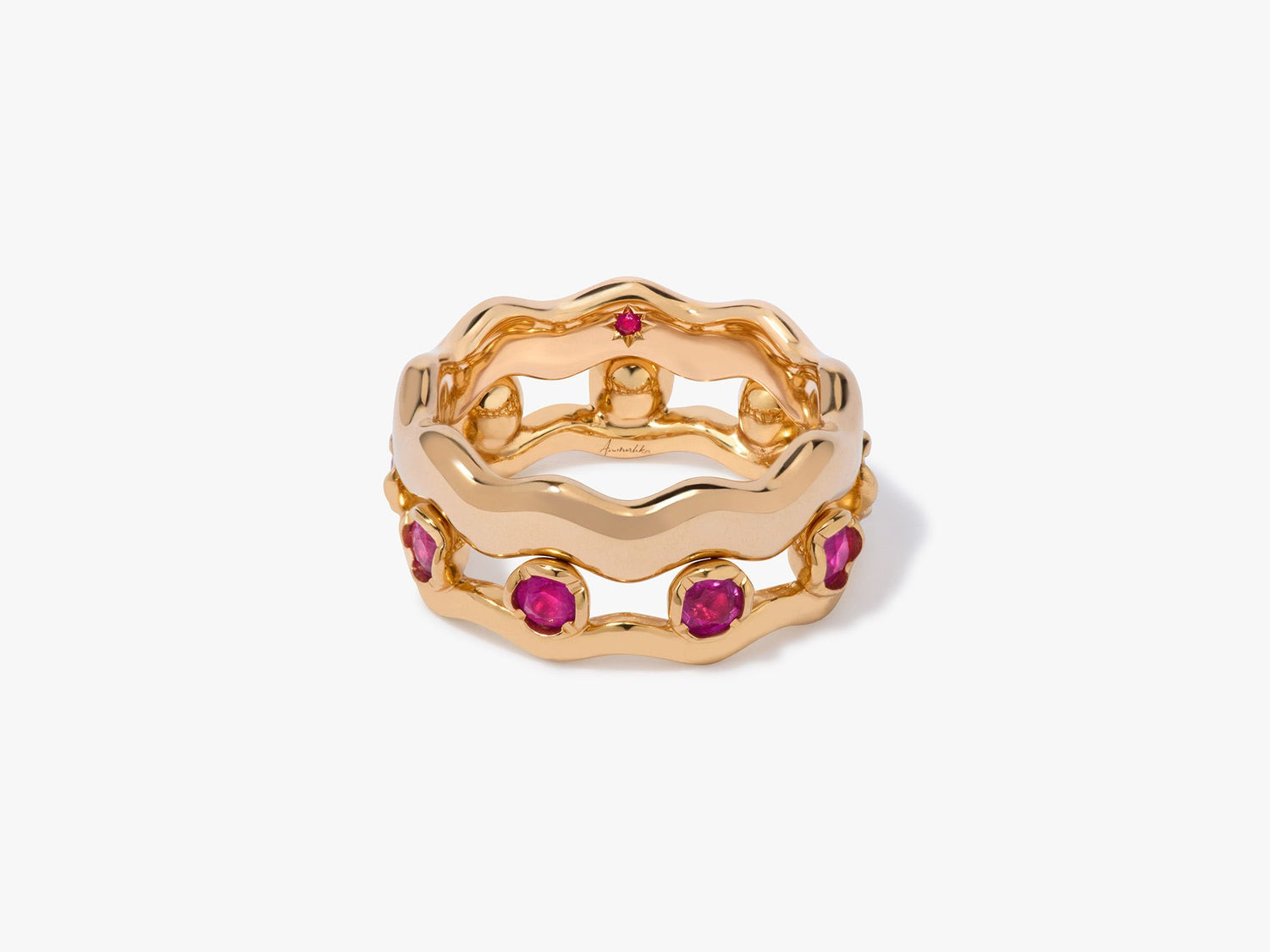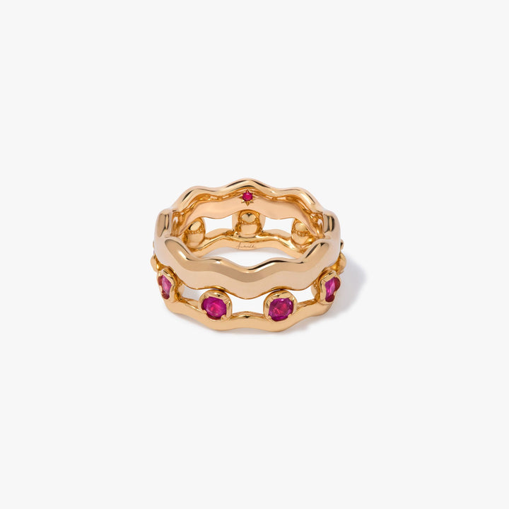This Whoopsie Daisy Sapphire & 4mm Ring Stack by Annoushka combines playful elegance with subtle color contrasts. Handcrafted in 18k yellow gold, the stack features a pink sapphire ring paired with a 4mm gold band handset with a tiny ruby symbolizing love and passion. Designed with the signature organic cup setting, it’s perfect for layering with other stacking rings for a personalized statement.