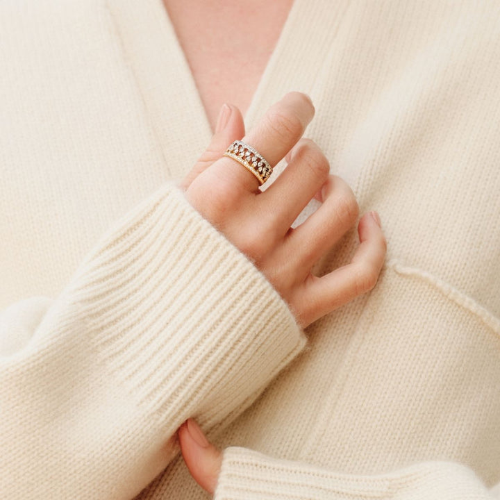 This Crown Eternity Ring by Annoushka is a treasured collectible that elevates any ring stack with endless styling versatility. Handcrafted in 18k yellow gold and set with diamonds, this iconic band can be worn solo, stacked, paired back-to-back, or interlaced as a stunning eternity or wedding band. Symbolizing unity and strength, it marks life’s milestones with playful, timeless elegance—a cornerstone of the Signatures collection.