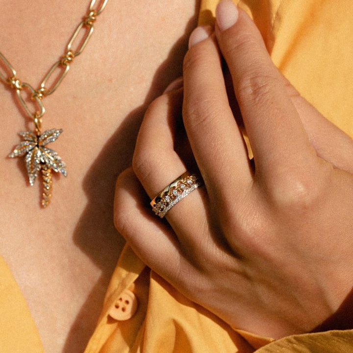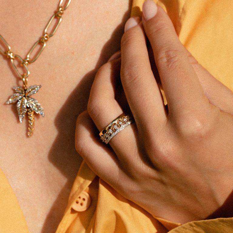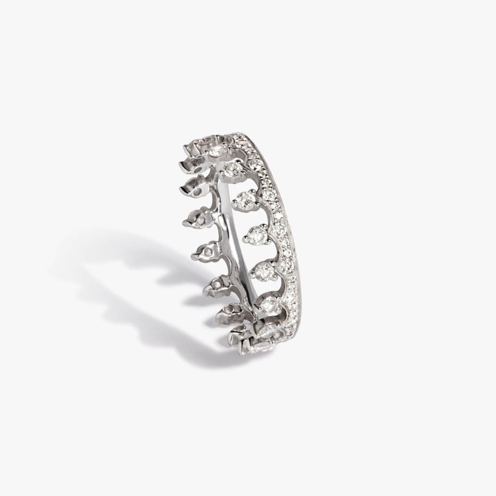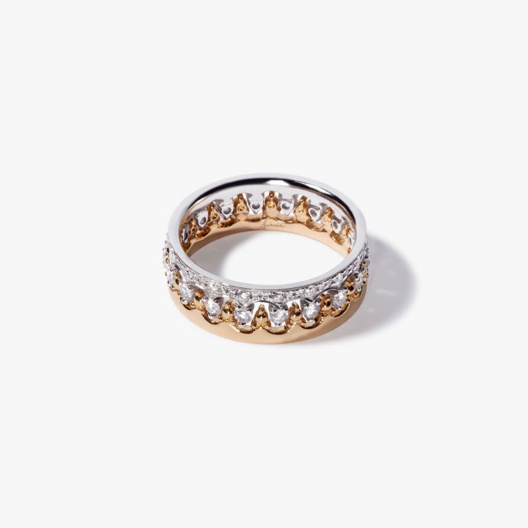 This Crown Diamond Ring Stack by Annoushka offers a contrasting blend of 18k yellow and white gold set with diamonds. Inspired by lace and designed to elevate ring stacking, these collectible bands can be worn solo, stacked, back-to-back, or interlaced as an eternity or wedding band. Symbolising unity and strength, they mark life’s milestones with timeless, playful elegance.