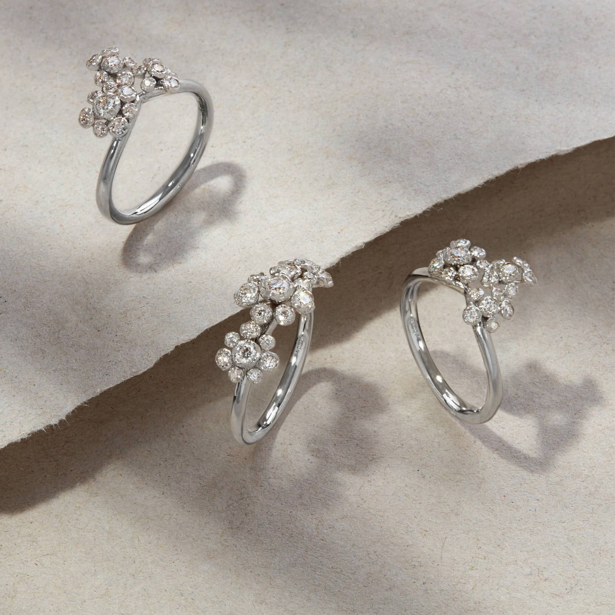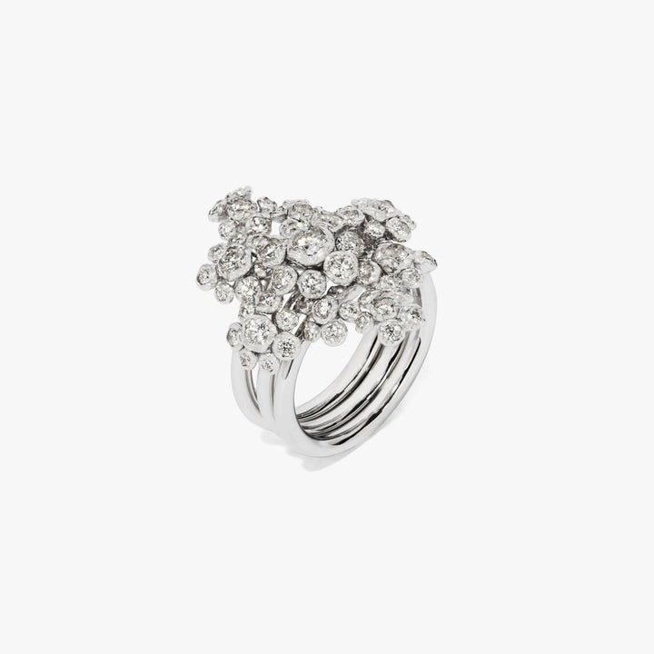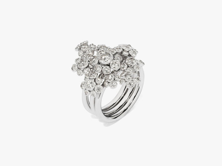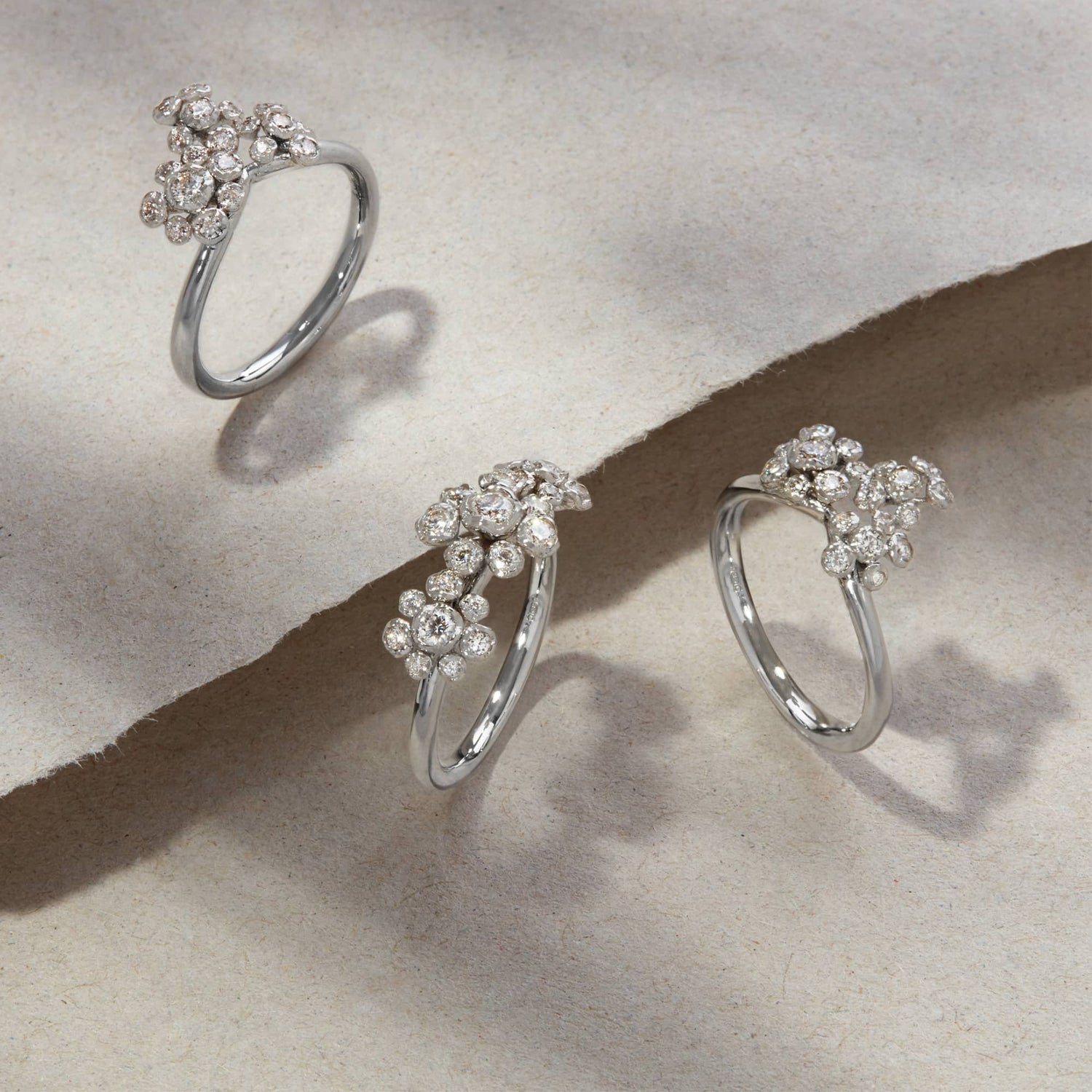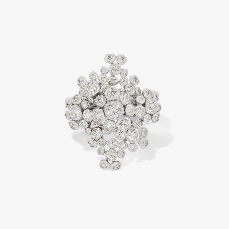 This Marguerite Cocktail Ring by Annoushka is a dazzling statement piece featuring 64 white diamonds totaling 1.27ct, crafted in 18k white gold. Designed as three interlocking rings for versatile wear—together or separately. Responsibly sourced diamonds and recycled gold embody responsible luxury. Harmonizes beautifully with Crown and Marguerite collections.