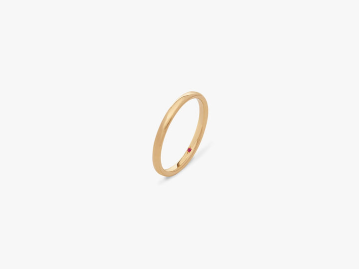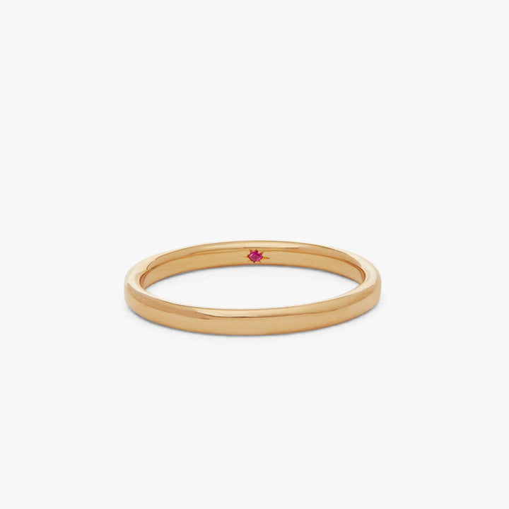 Handcrafted in 100% recycled 18k yellow gold. Flush setting with hidden 0.01ct red ruby inside band. 2mm width. Unisex wedding band design.