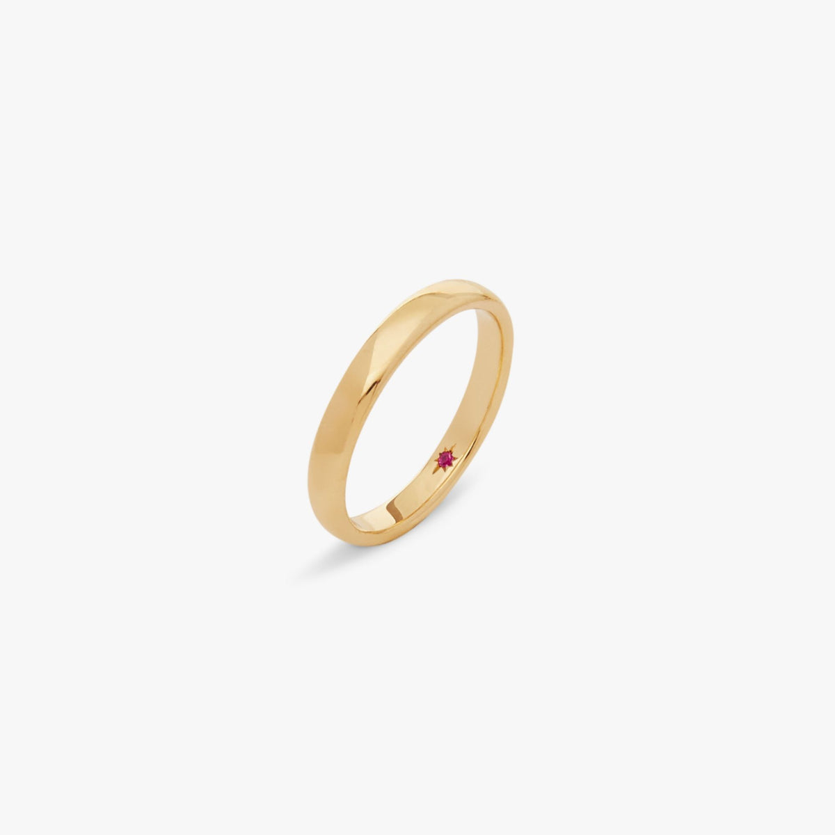 This 3mm Wedding Ring by Annoushka is handcrafted in 18k yellow gold with the signature flush setting. A hidden 0.01ct red ruby inside the band symbolizes the legendary vein connecting the fourth finger directly to the heart. Crafted from 100% recycled gold, designed to harmonize with the Crown and Marguerite collections. Suitable for both men and women, with a high polish finish for everyday elegance.