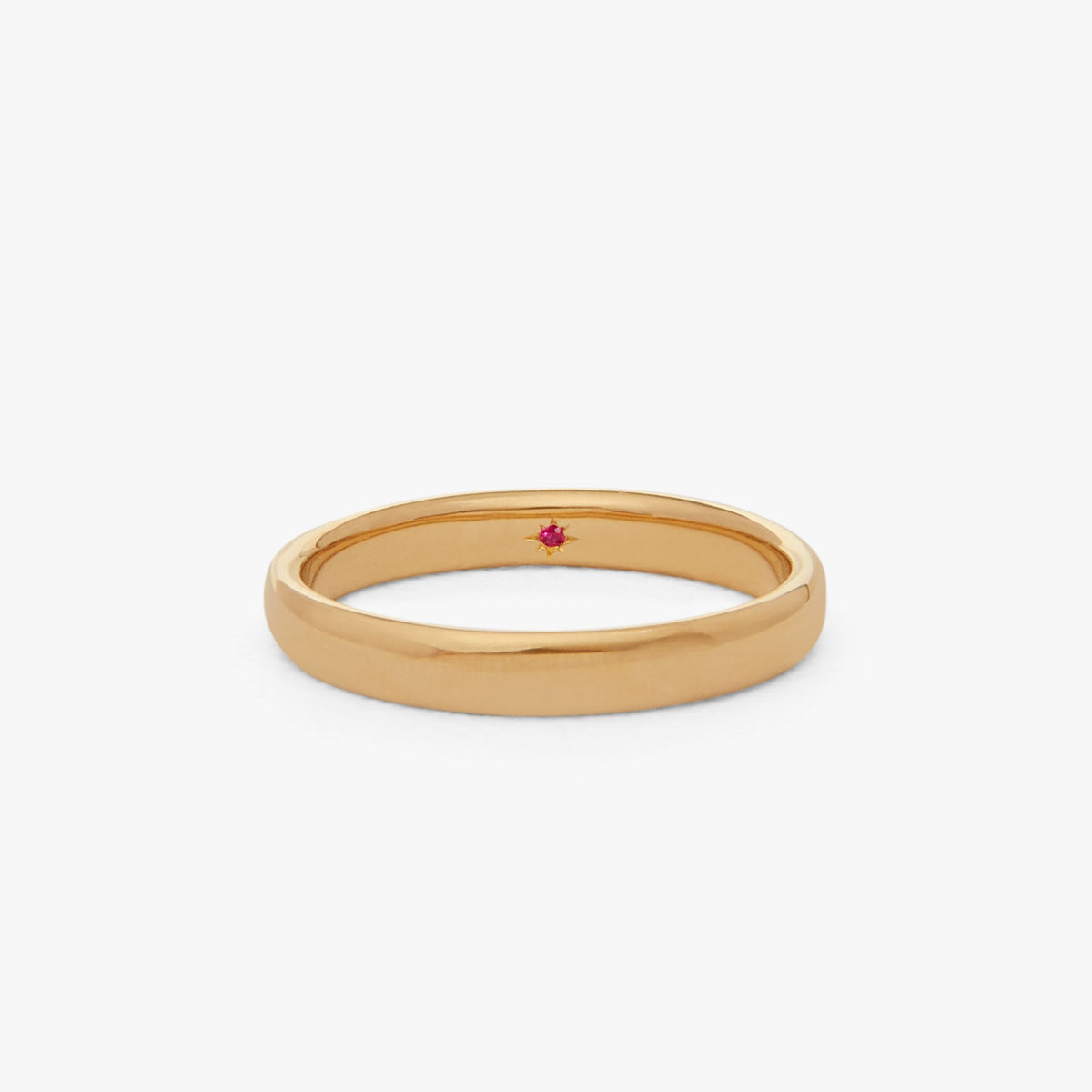 Handcrafted in 100% recycled 18k yellow gold. Flush setting. 3mm band width. Hidden 0.01ct red ruby inside band. Unisex design.