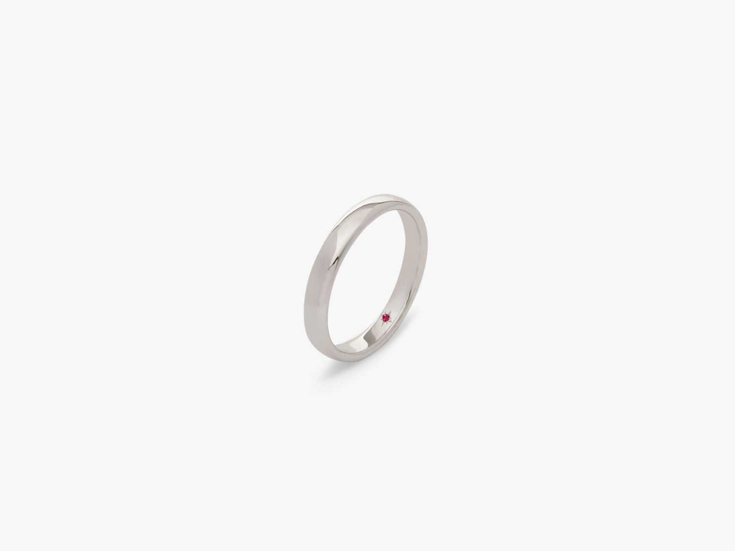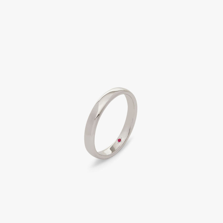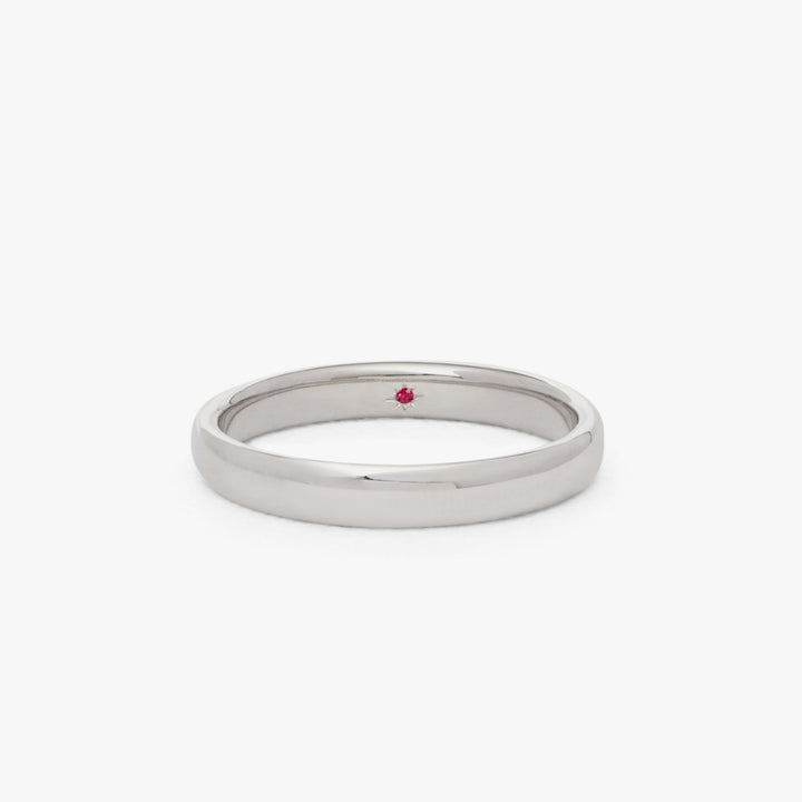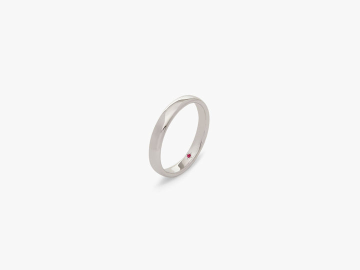 Handcrafted in 100% recycled 18k white gold. Flush setting. 3mm band width. Hidden 0.01ct red ruby inside band. Unisex design.