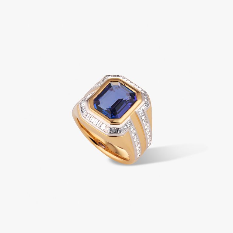 This Tanzanite & Diamond Ring by Annoushka is a striking cocktail statement rooted in Art Deco precision and architectural flair. The emerald-cut tanzanite, handpicked by Annoushka in Jaipur, radiates a regal blue hue, encased in a geometric halo of baguette and princess-cut diamonds. With sculpted sides, a breathable internal gallery, and channel-set detailing, this design ensures comfort without compromising on luxury. A talisman for wisdom and truth, this is December’s birthstone redefined for the modern woman.