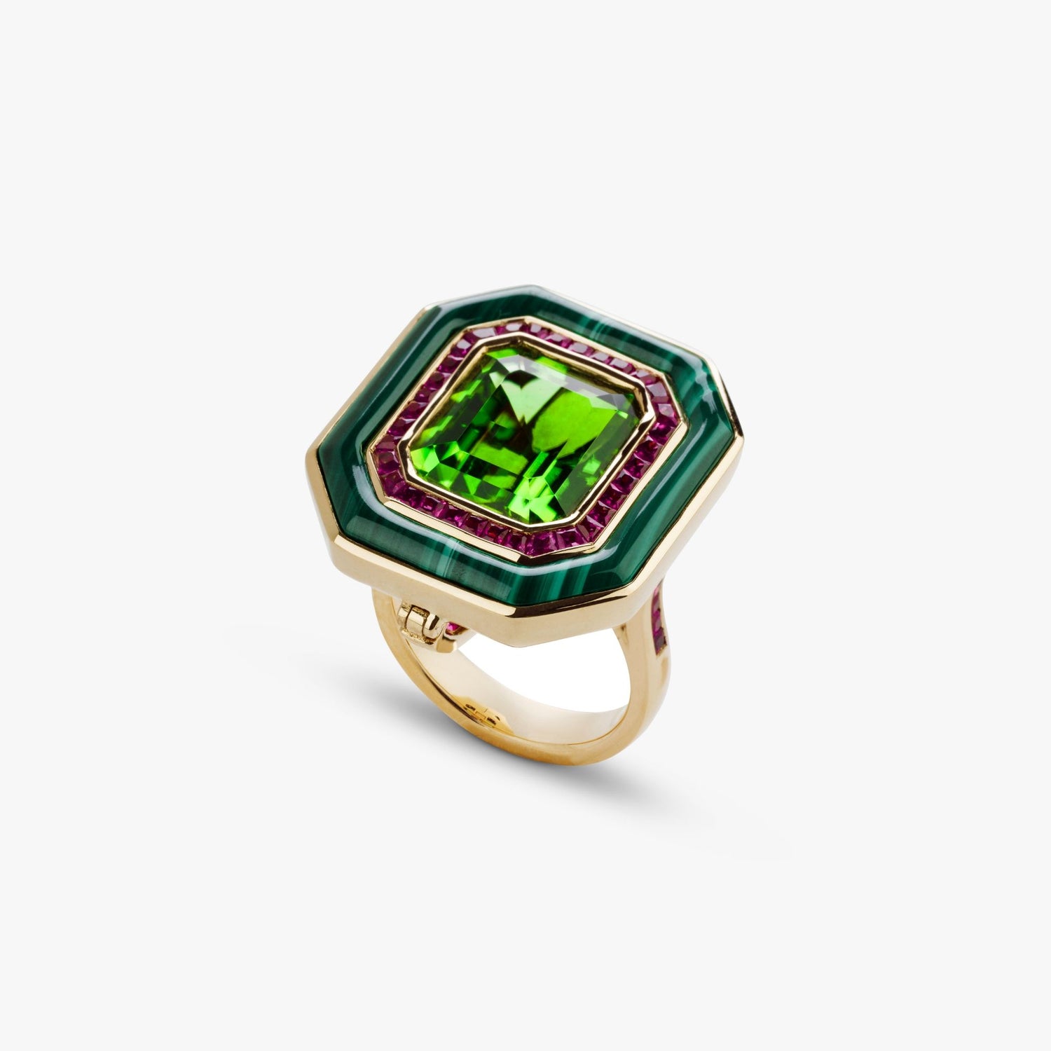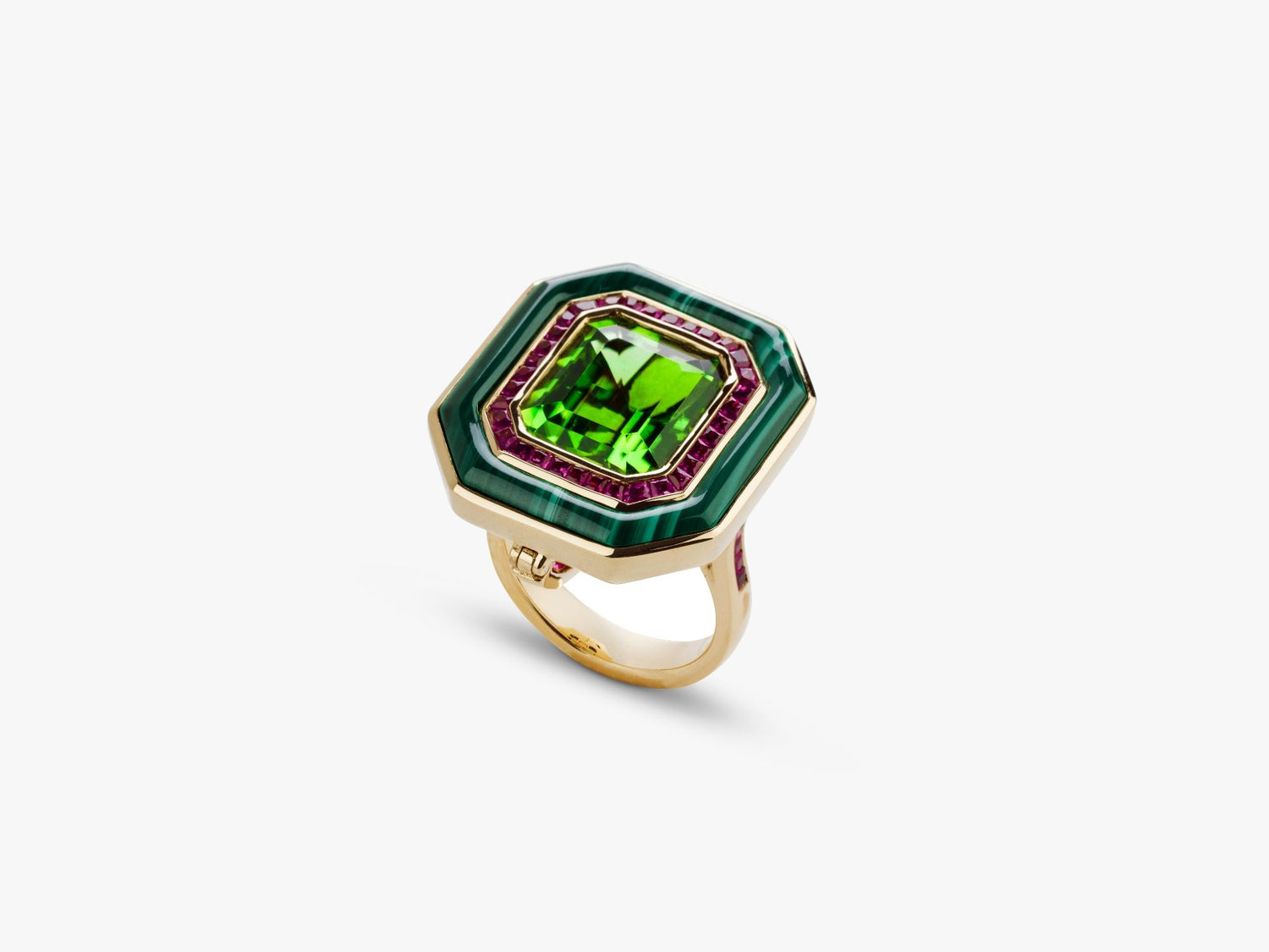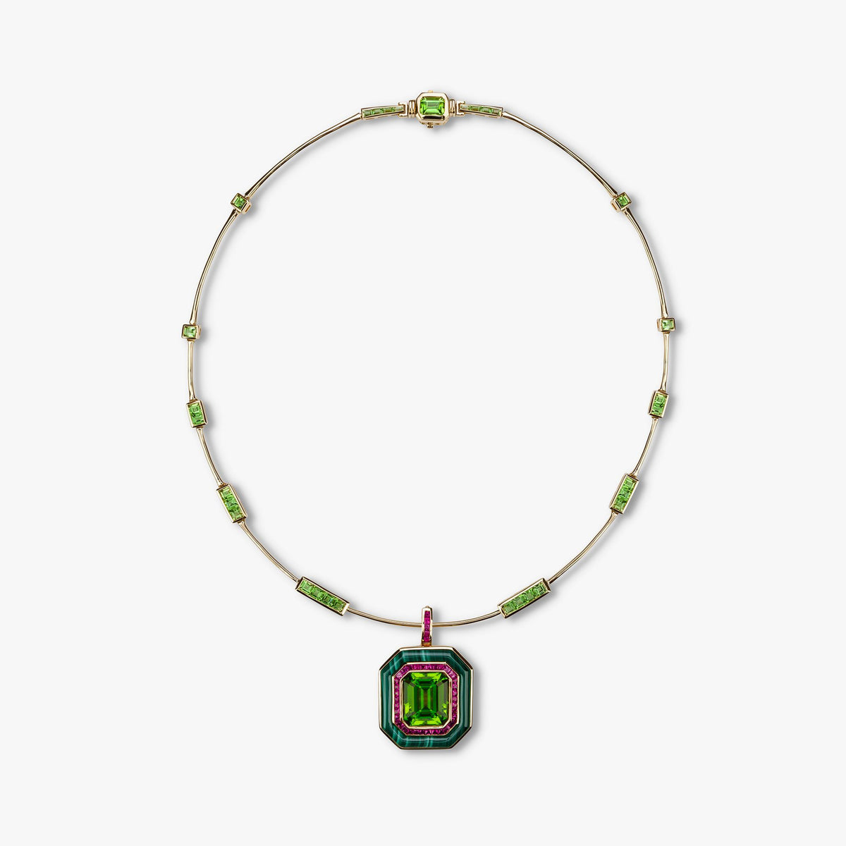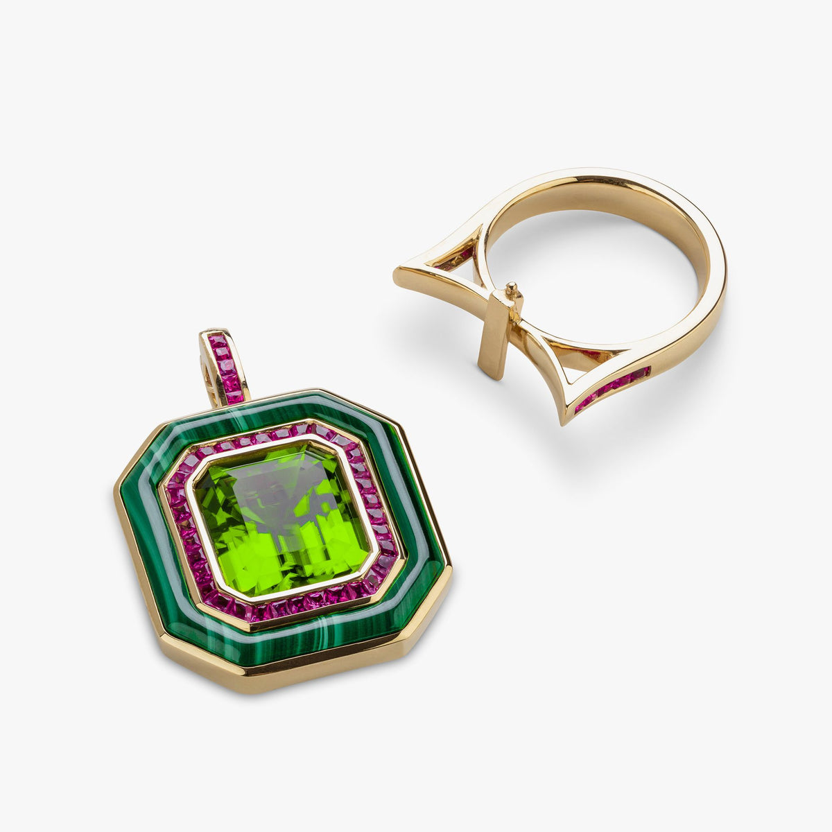 Crafted in recycled 18k yellow gold with a 9.05ct octagon-cut Fuli peridot, pink sapphires, and malachite. Detachable ring-to-pendant mechanism with hidden bail clasp. High polish finish.