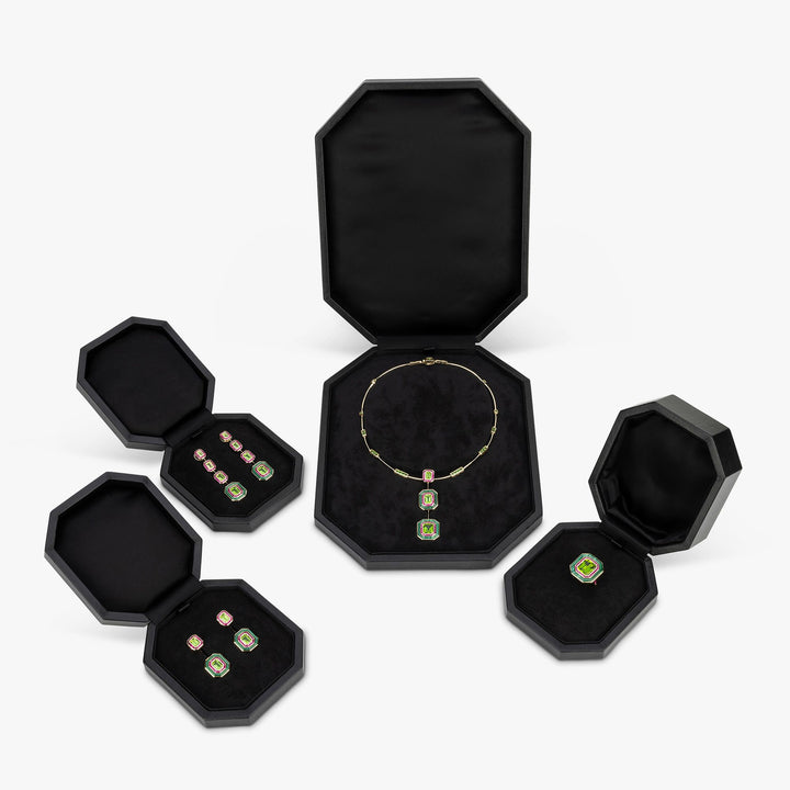 This Radiance Ring by Annoushka is an extraordinary statement of transformable luxury. At its center, a vivid octagon-cut Fuli peridot glows within a concentric halo of Madagascan pink sapphires and rich malachite. Crafted in recycled 18k yellow gold, the ring unclips from its shank to become a pendant—ready to hang from the accompanying choker. Channeling the geometric flair of Art Deco and the designer’s signature playfulness, it embodies sophisticated innovation.
