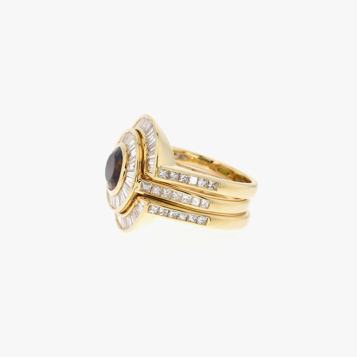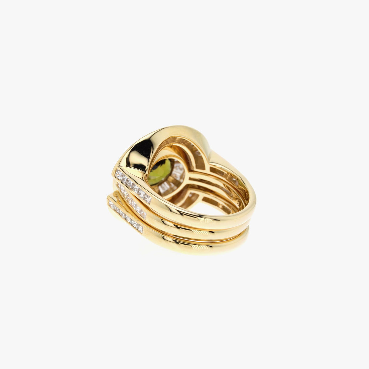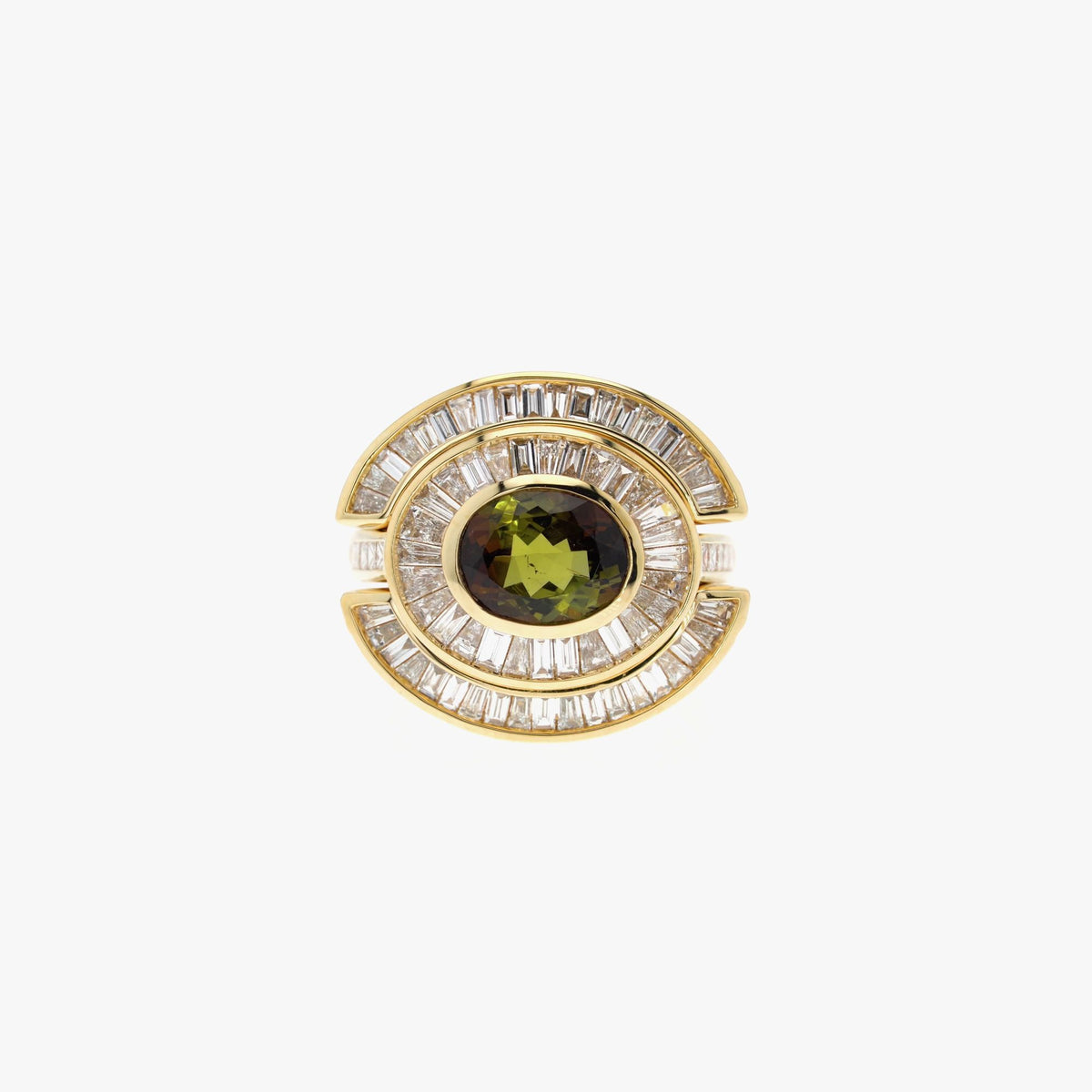 Centerpiece: 18k recycled yellow gold with 2.29ct andalusite and 1.21ct baguette diamonds. Jackets: 18k recycled yellow gold with 66 white diamonds (1.85ct total). High polish finish. Size N.