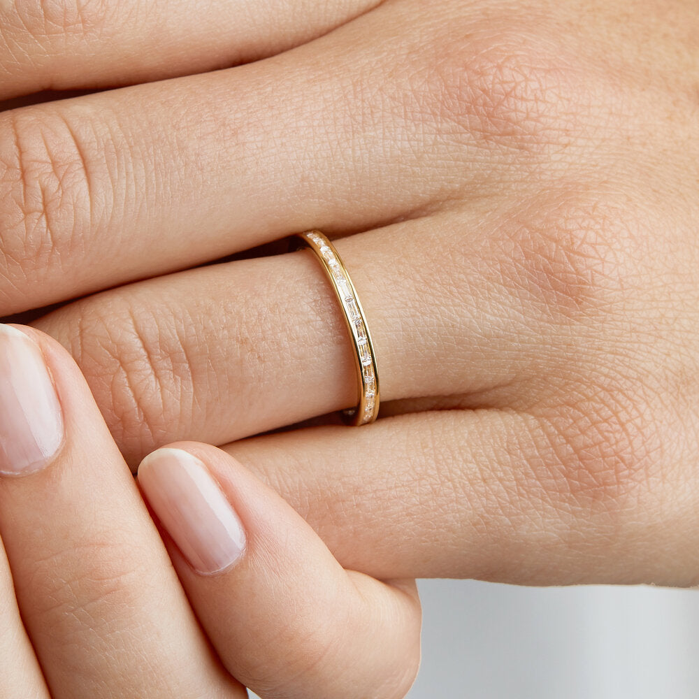 Available in solid sterling silver and 14K gold-plated sterling silver, featuring baguette crystals in a half eternity design.