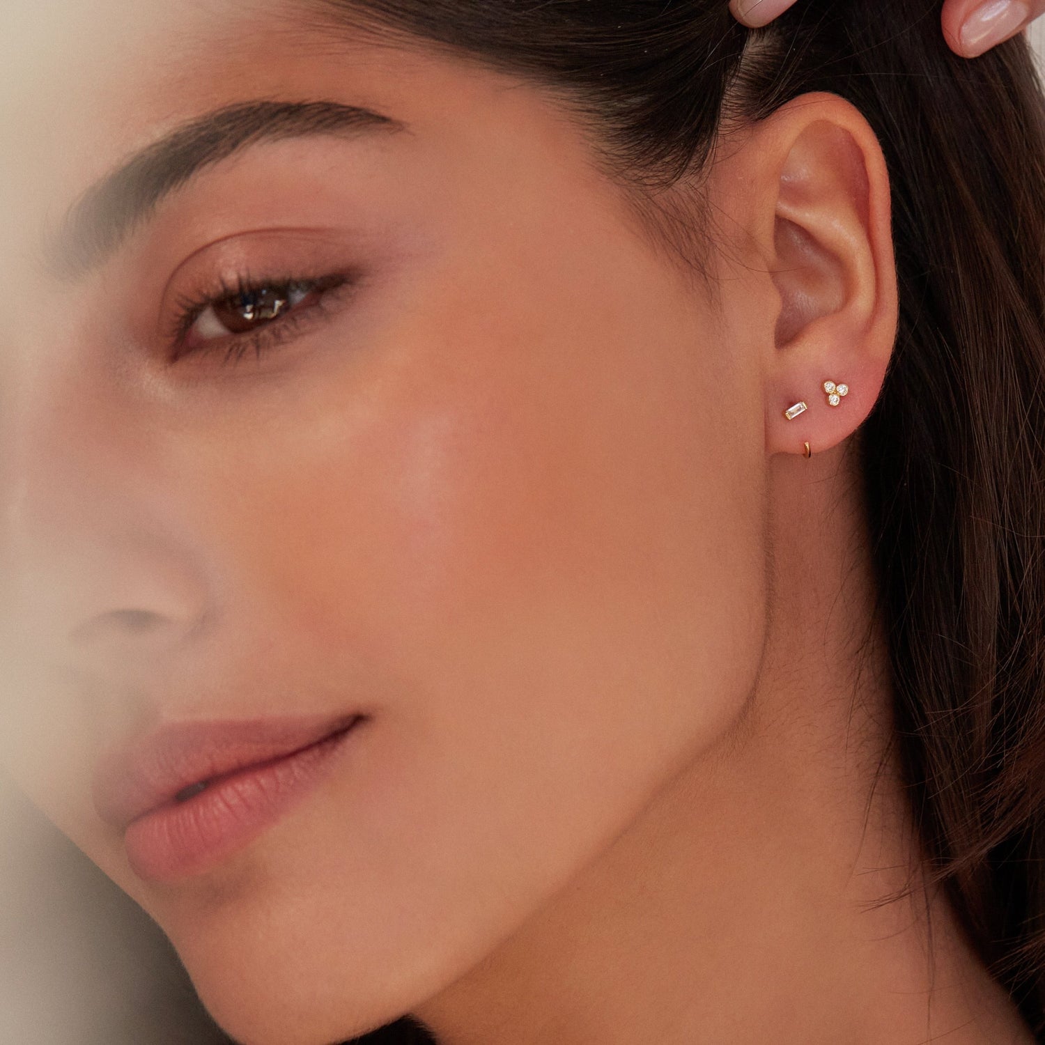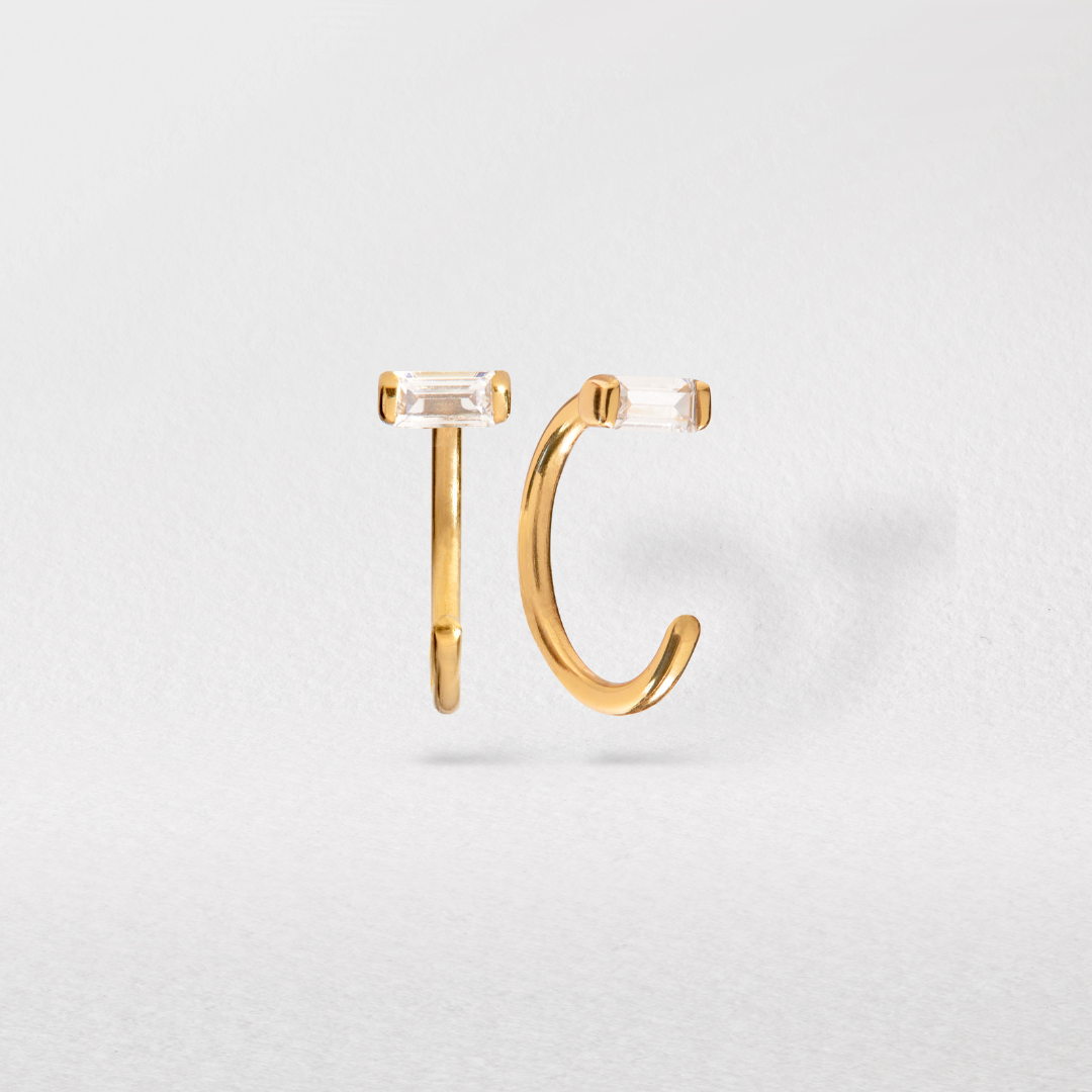 These Gold Diamond Style Baguette Lobe Hoop Earrings by Lily & Roo offer an elegant and modern design. The earrings delicately curl around the back of your earlobe, with only the baguette crystal and the end of the hoop visible. Made of 18ct gold-plated sterling silver, these hoops add a refined touch to any outfit and are perfect for stacking.