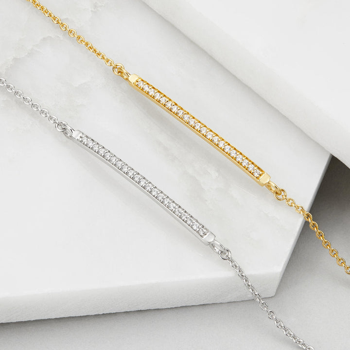 This Gold Diamond Style Bar Bracelet by Lily & Roo offers the same timeless elegance as its silver counterpart, but with the warmth of gold. The diamond-style bar design adds sophistication and can be worn from day to night, making it a versatile accessory for any occasion. Pair it with other pieces from the collection or wear it alone for a refined look.