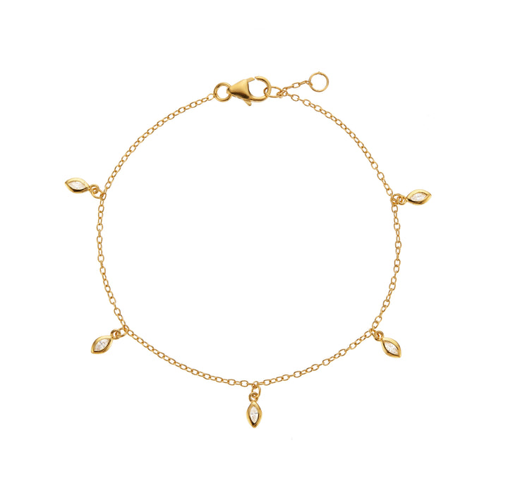 Made of solid sterling silver, plated in 18ct gold, featuring diamond style marquise drops. Adjustable from 17cm to 18cm with an extender loop.