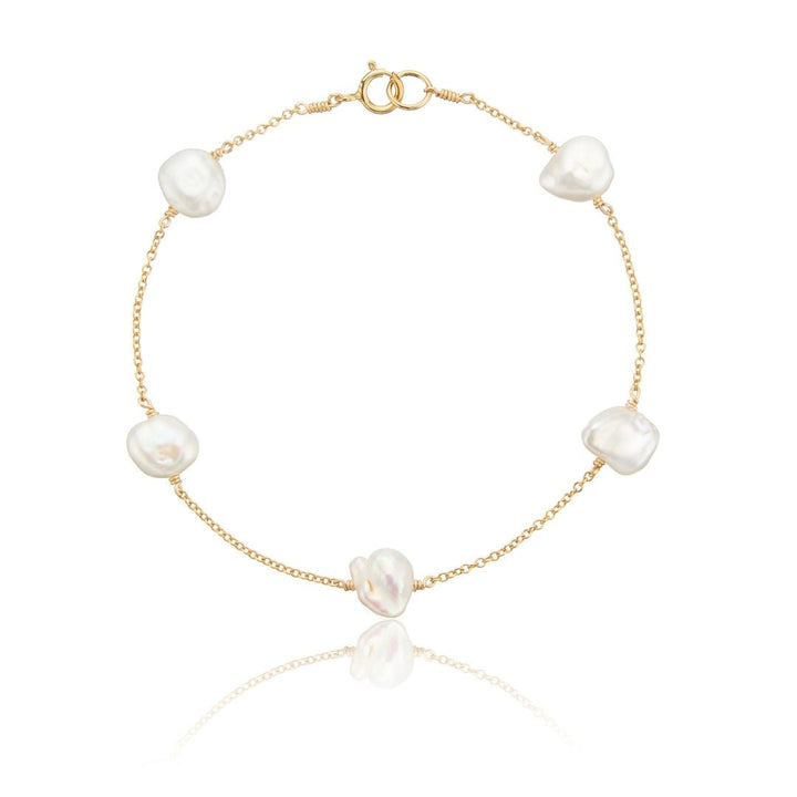 This Gold Five Baroque Pearl Bracelet by Lily & Roo is a modern and sophisticated piece, featuring five unique baroque freshwater pearls. Handcrafted in our London studio, this bracelet is perfect for weddings, anniversaries, or as a thoughtful gift for someone special. The varying shapes and sizes of the pearls ensure that each bracelet is one-of-a-kind, adding a personal touch to this timeless piece.