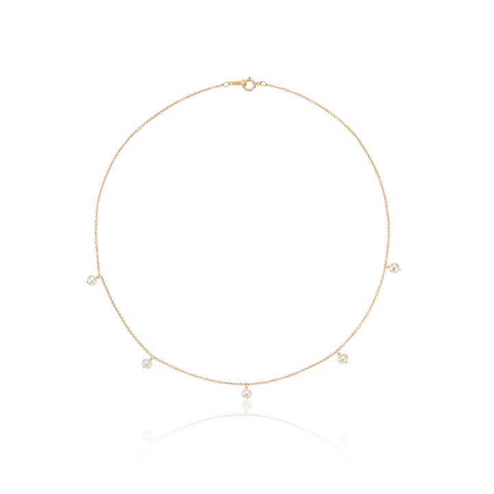 This Gold Five Pearl Drop Choker by Lily & Roo is handmade with love in our London studio, featuring five freshwater pearls that gracefully drop down for an elegant and timeless look. This choker is perfect for weddings, adding a touch of sophistication to a bride or bridesmaid's ensemble.