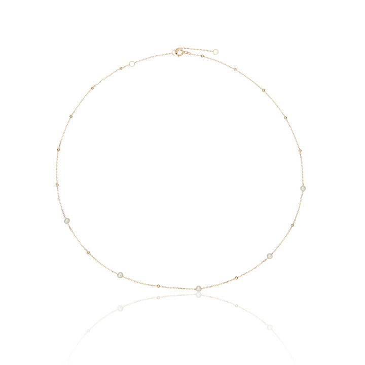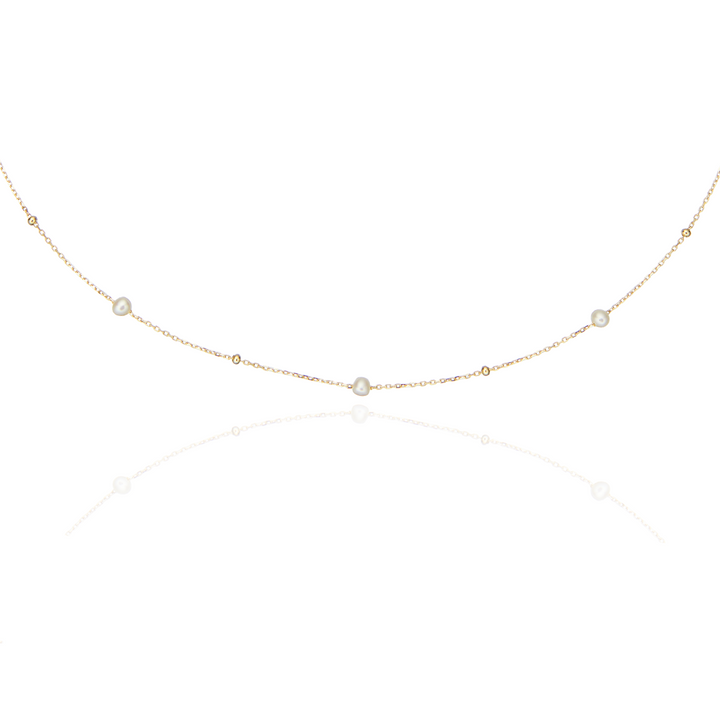 This Gold Five Pearl Satellite Necklace by Lily & Roo adds a sophisticated touch to any outfit. Featuring five delicate freshwater pearls on a satellite chain, this necklace can be adjusted from 16 inches (41cm) to 18 inches (46cm), allowing you to layer it with other necklaces for a chic look. Perfect for both everyday wear and special occasions.