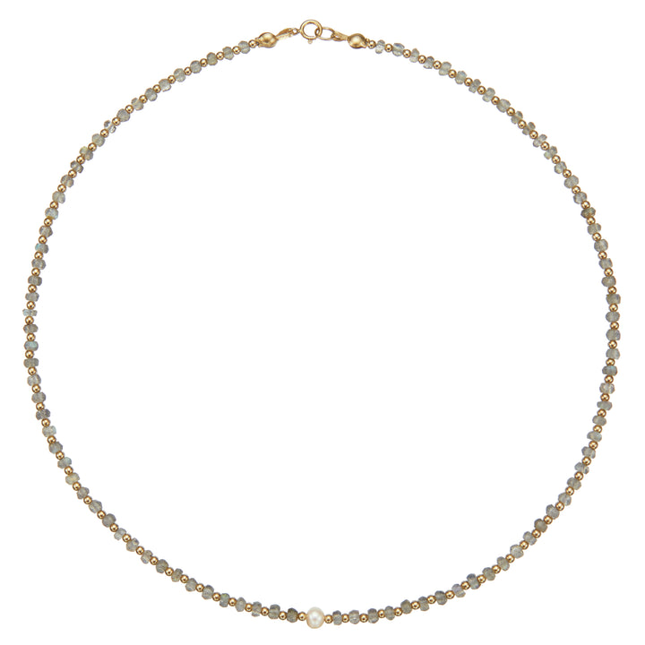 Gold-filled beads and labradorite gemstones, featuring a genuine freshwater pearl. Also available in solid sterling silver.