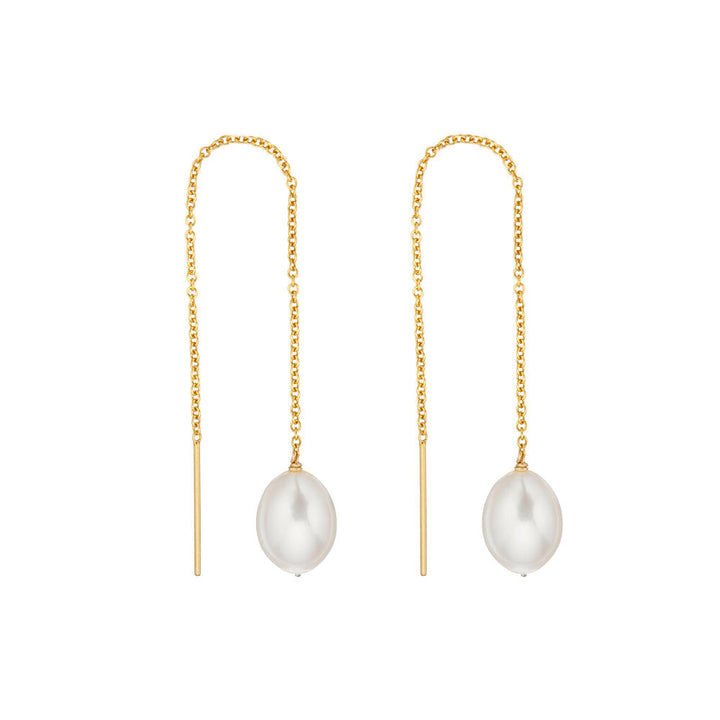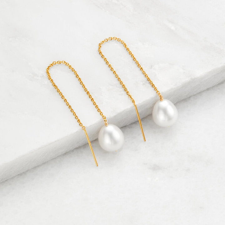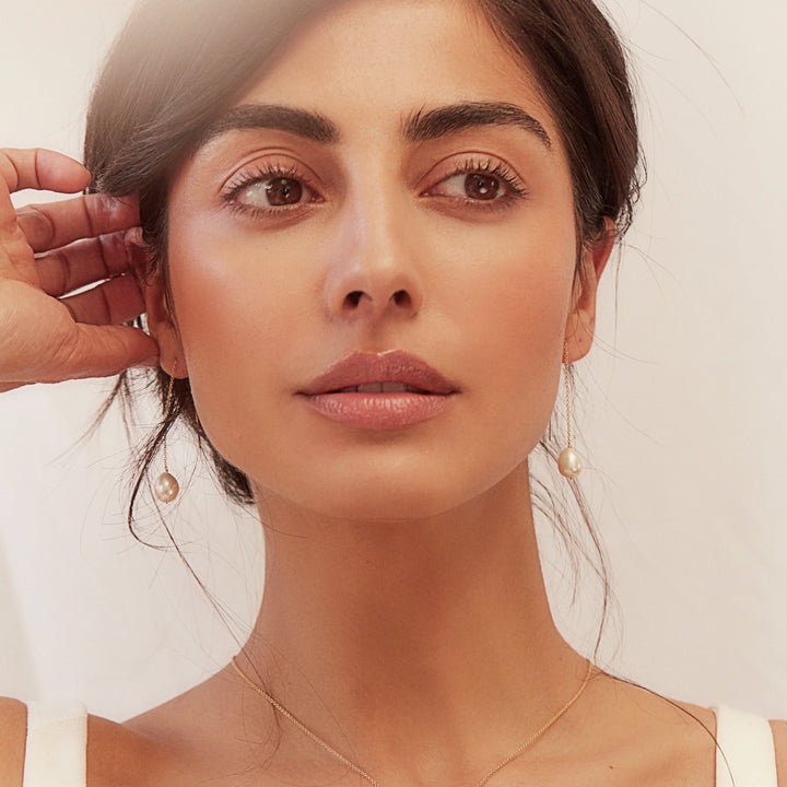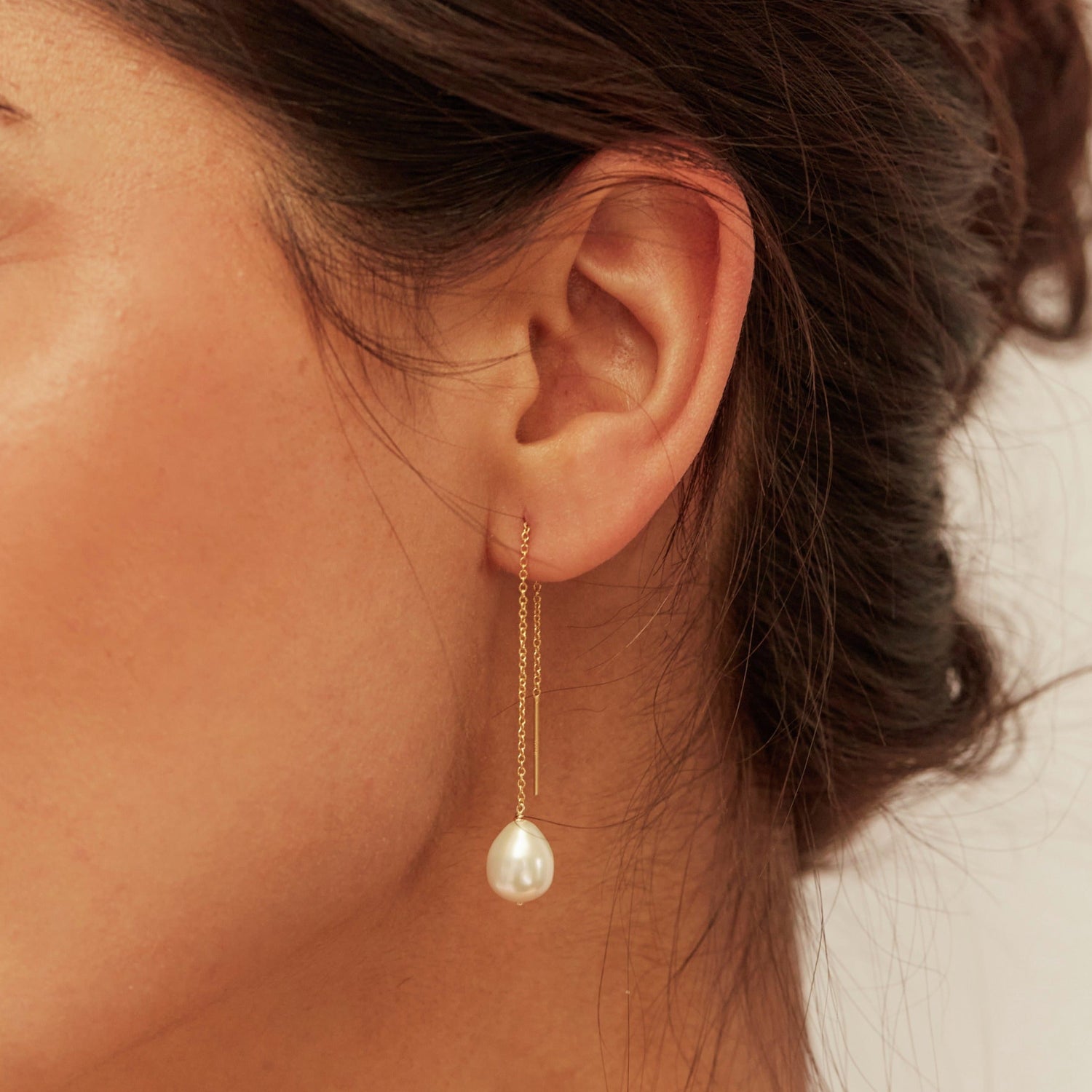 These Gold Large Pearl Drop Ear Threaders by Lily & Roo bring a modern twist to classic pearl earrings. Designed for customizable wear, these threaders allow you to adjust their length for a personalized style. Handmade in London, they add a refined, effortless touch to bridal looks or elegant evening wear.