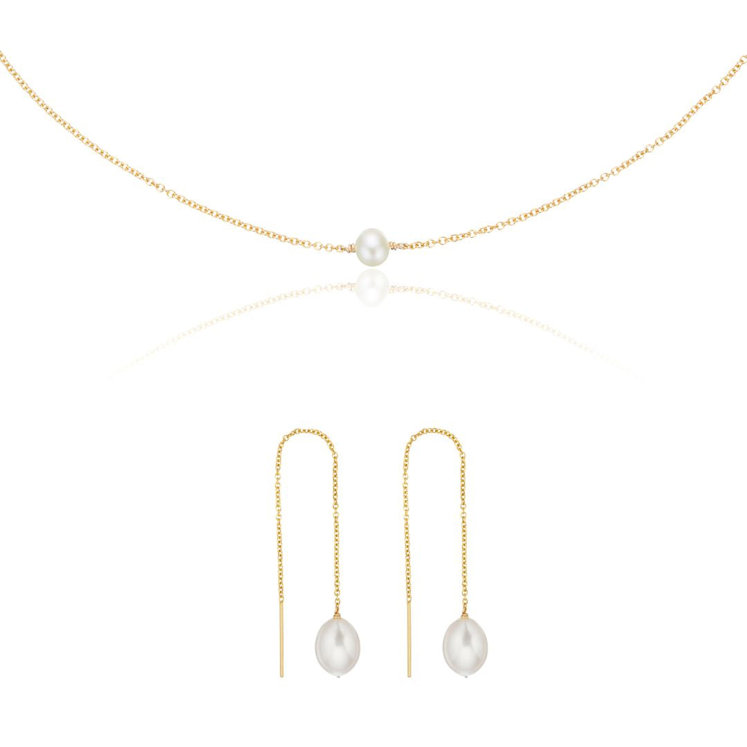 Gold Large Pearl Drop Ear Threaders and Single Pearl Choker Gift Set