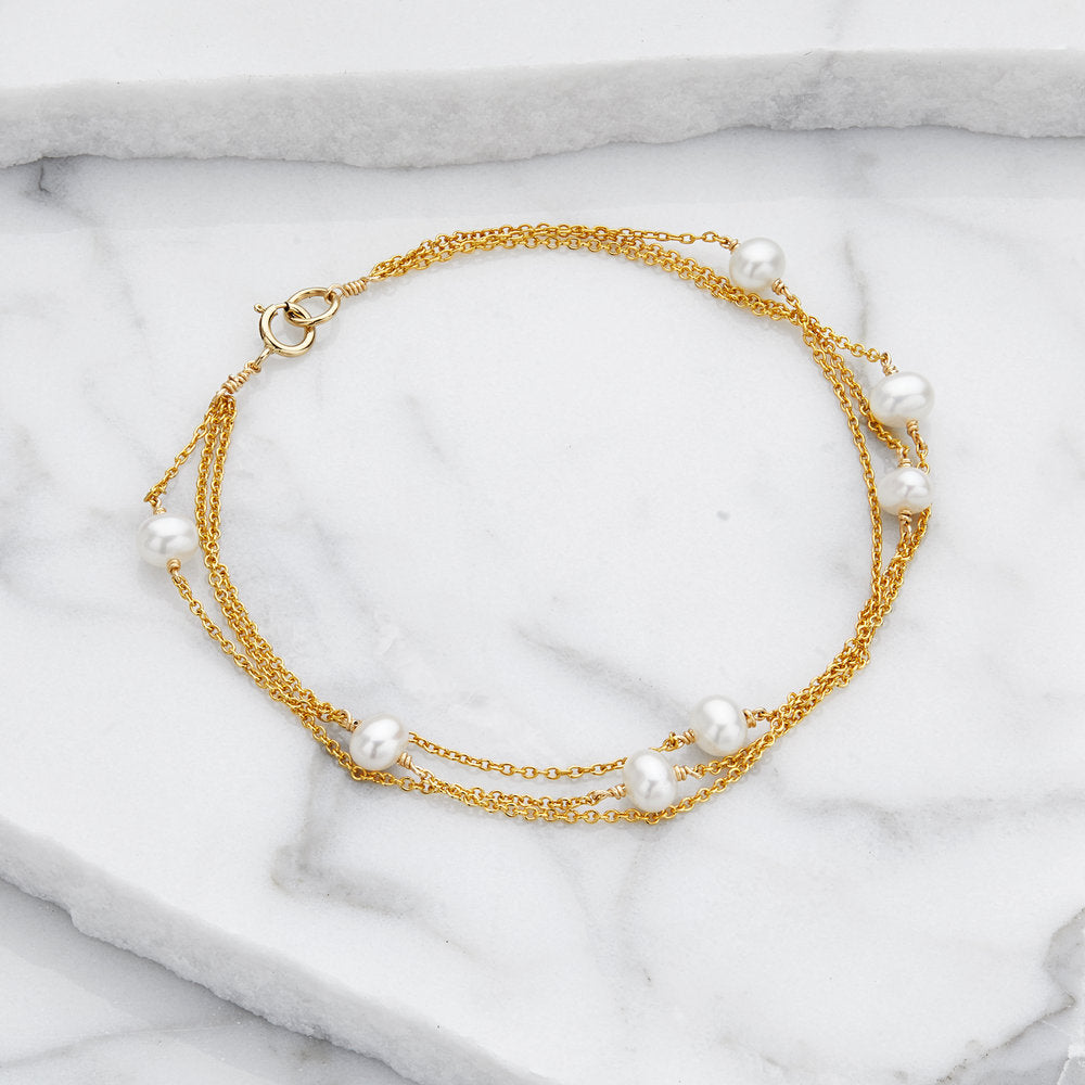 This Gold Layered Pearl Bracelet by Lily & Roo is a stunning, handmade piece featuring layered freshwater pearls. It is the perfect jewelry gift for a bride or bridesmaid to wear on their wedding day. The timeless elegance of the pearls complements any outfit, making it a versatile addition to any collection. Handmade with love in our London studio, this bracelet is a true work of art.