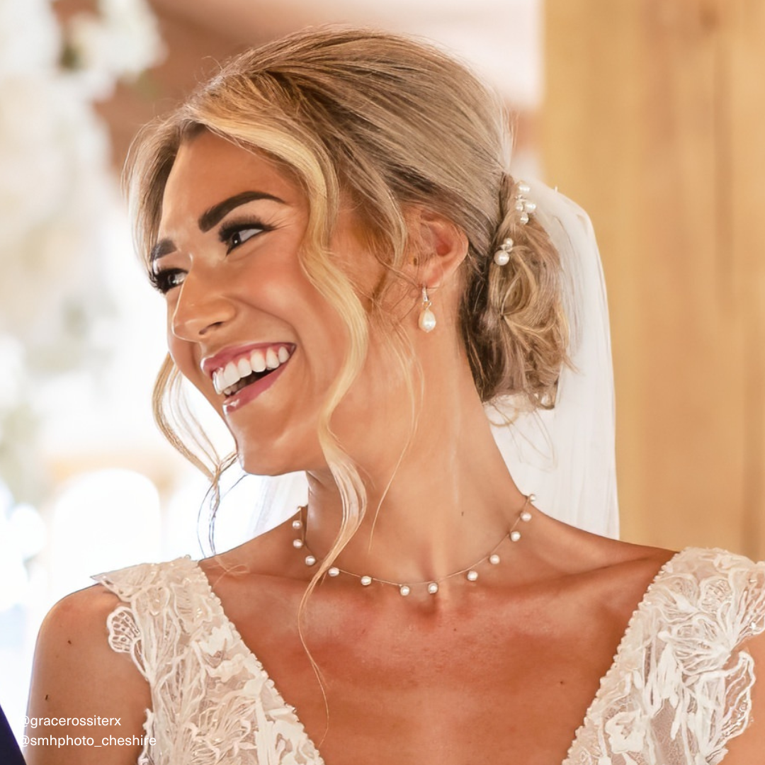 This Gold Pearl Drop Choker by Lily & Roo is a show-stopping piece, handmade in our London studio with genuine freshwater pearls. Perfect for weddings, this choker is an elegant accessory for any bride or her bridesmaids. The delicate design adds sophistication to any bridal look or special occasion.