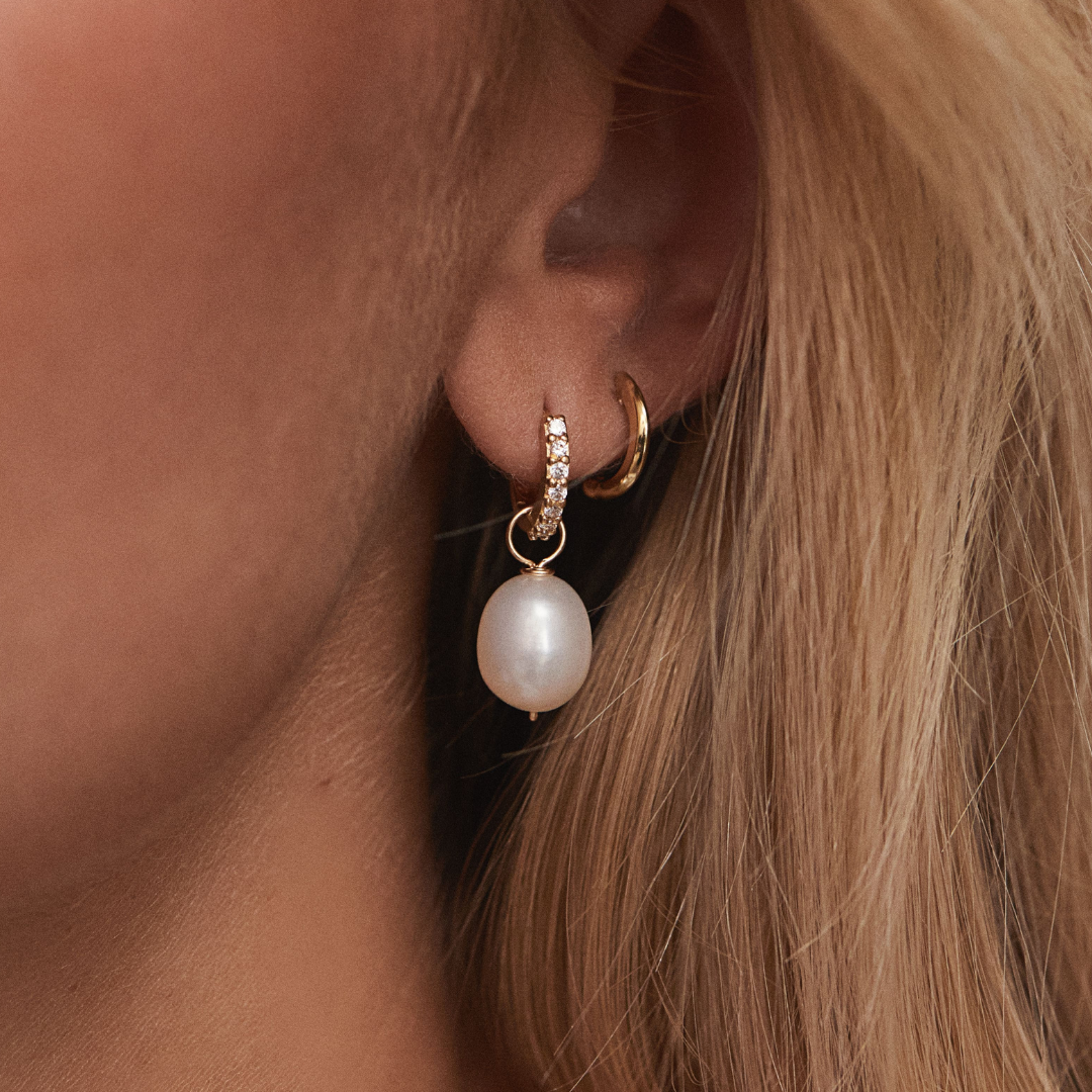 These Gold Pearl Drop Huggies and Plain Huggies Earrings Gift Set by Lily & Roo is a beautiful pairing of two timeless earring styles. The set includes a pair of Gold Huggie Pearl Drop Earrings and a pair of Gold Plain Huggie Hoop Earrings. The detachable pearls add a layer of versatility, allowing you to create a different look for any occasion, while the secure hinge makes them effortless to wear. Whether you’re styling them for a wedding or as a thoughtful gift for a special occasion, this set speaks to elegance and customization. A perfect choice for brides or bridesmaids, it’s ideal for stacking or wearing alone, giving you endless styling options.