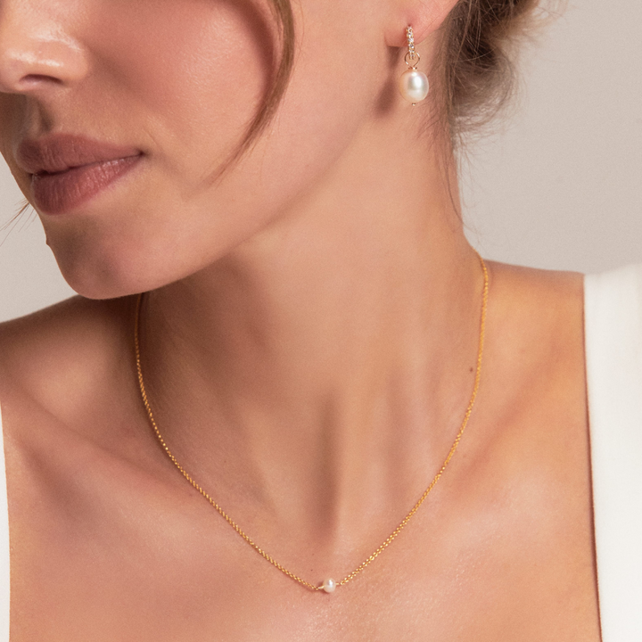 This Gold Pearl Drop Huggies and Single Pearl Choker Gift Set by Lily & Roo is an exquisite pairing of two pearl jewelry classics. The single pearl choker offers timeless sophistication, while the huggie hoop earrings provide a versatile styling option with removable pearls. A stunning gift for brides, bridesmaids, or any special occasion.