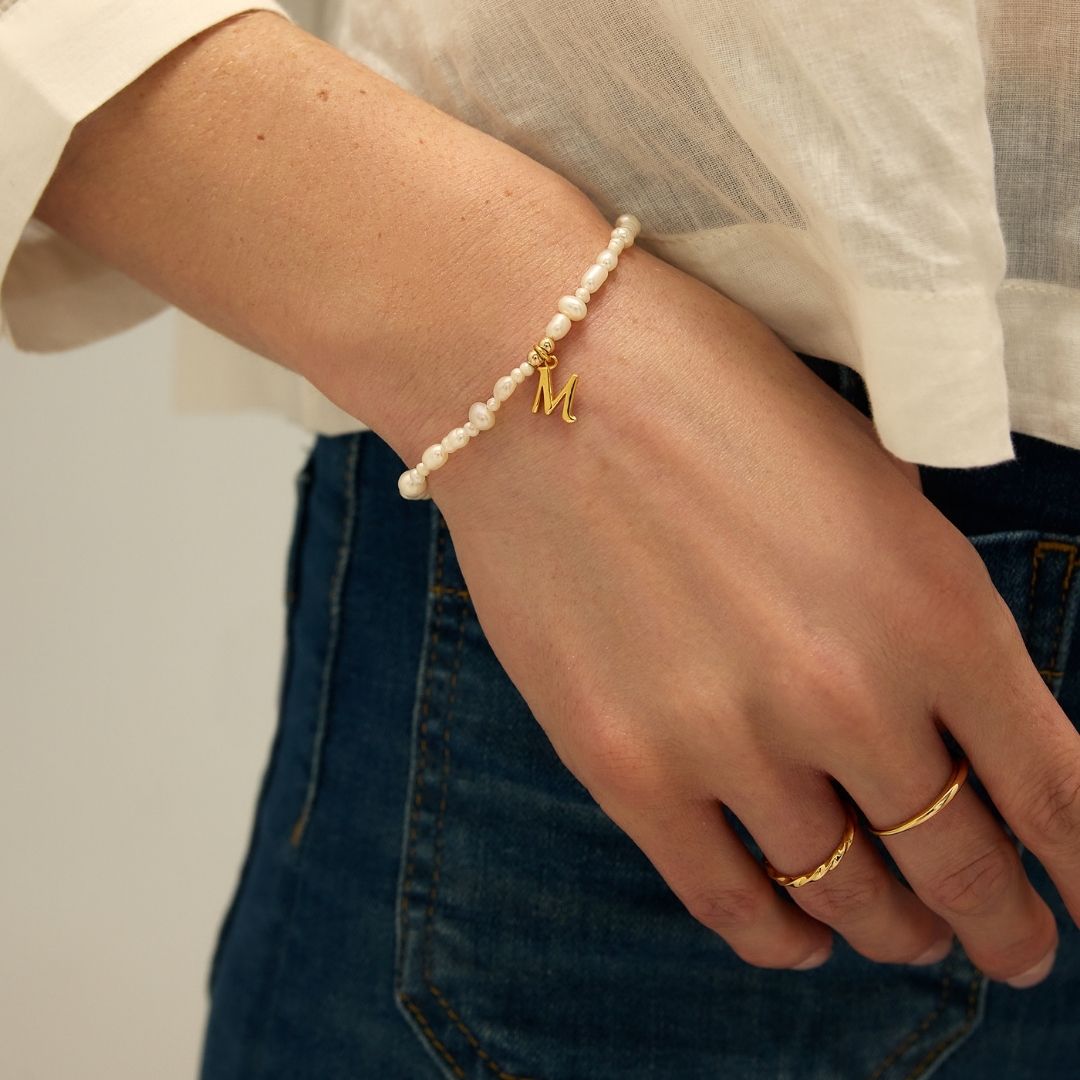 This Gold Pearl Initial Letter Bracelet by Lily & Roo is a personalized and meaningful accessory that keeps a special connection close at all times. Made with an assortment of freshwater pearls, this bracelet can be customized with an initial, making it a perfect gift for someone special. Its timeless design makes it ideal for everyday wear or as a cherished gift.