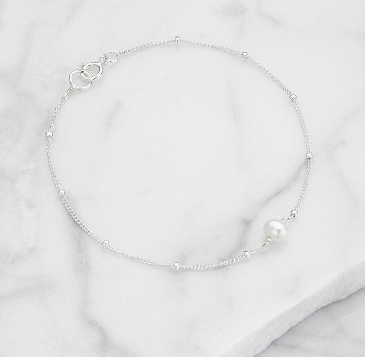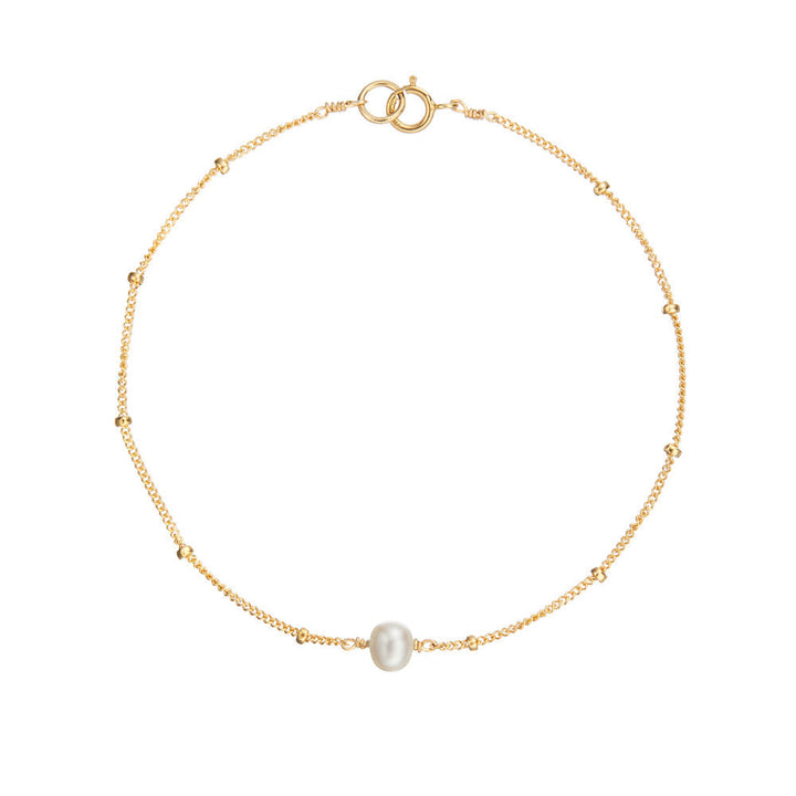 This Gold Satellite Pearl Bracelet by Lily & Roo is a delicate and sophisticated piece, ideal for a bride on her wedding day or for adding a touch of elegance to any outfit. Handmade in our London studio, this bracelet features a single freshwater pearl on a satellite chain. Its minimalist design ensures it pairs perfectly with other jewelry or can stand alone.