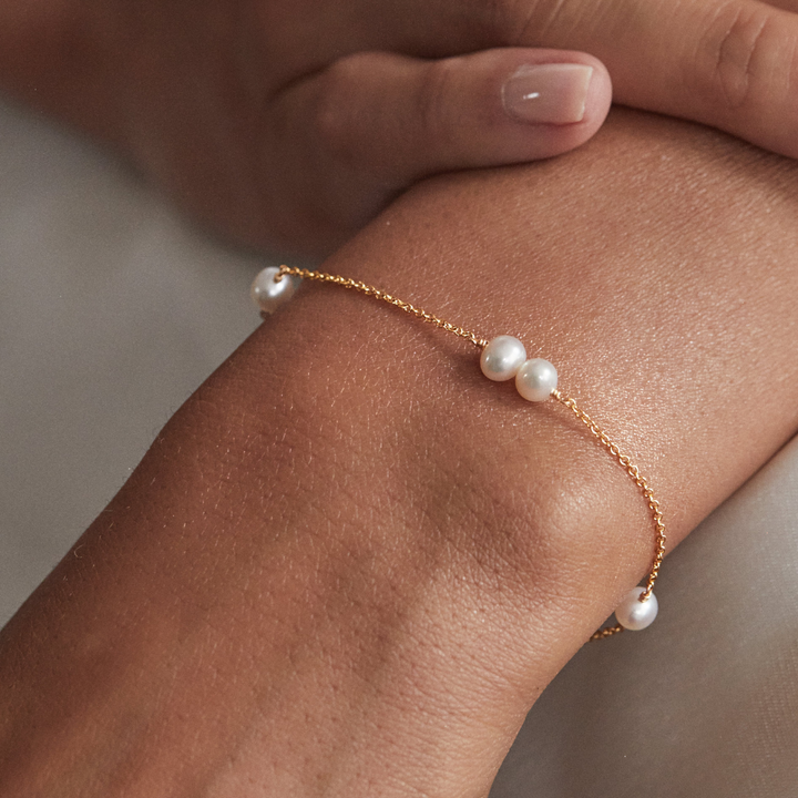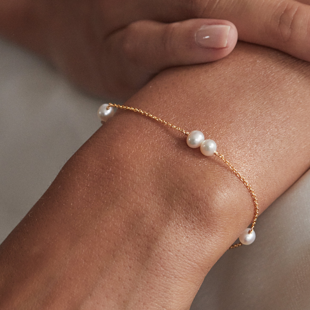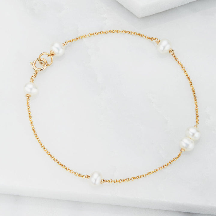 This Gold Six Pearl Bracelet by Lily & Roo is a delicate and elegant piece, perfect for weddings or any special occasion. Handmade with love in our London studio, this bracelet features six freshwater pearls, adding timeless beauty to any outfit. It can be worn on its own or stacked with other bracelets for a more layered look.