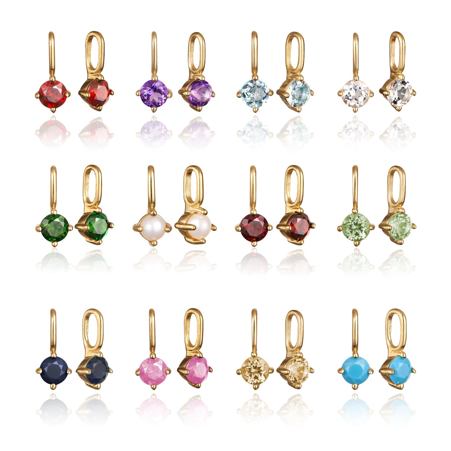 18ct gold-plated sterling silver, featuring a choice of birthstones: Garnet, Amethyst, Aquamarine, Topaz, Emerald, Freshwater Pearl, Ruby, Peridot, Sapphire, Pink Tourmaline, Citrine, and Turquoise. Also available in solid gold and sterling silver finishes.