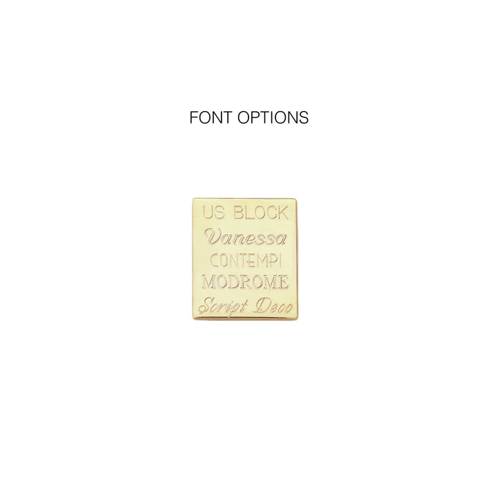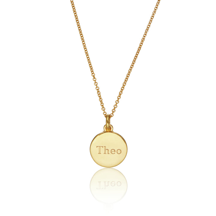Made from solid sterling silver, plated in 18ct gold, featuring a small round engravable disc. Engraving available with up to 20 characters in one of five fonts.