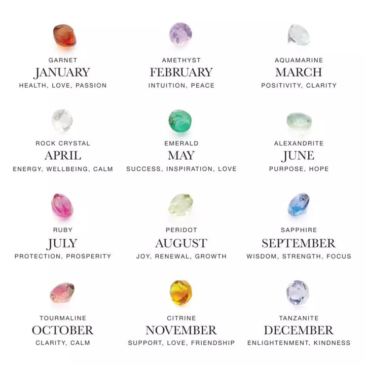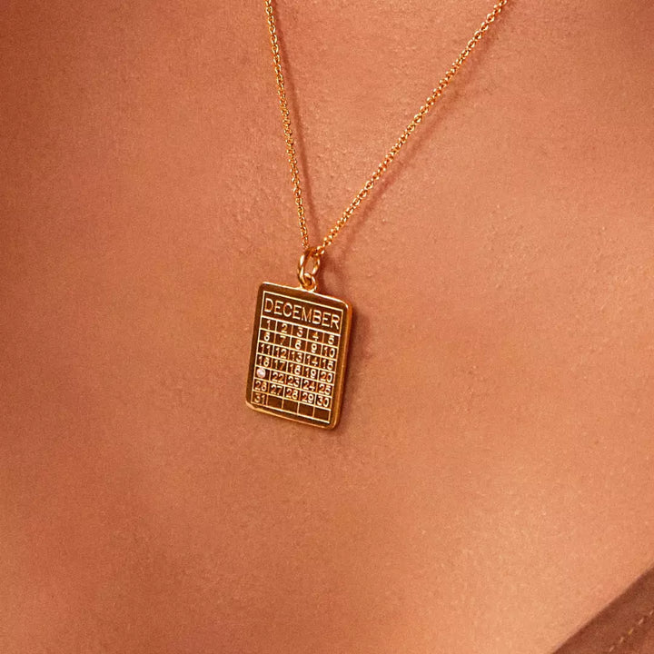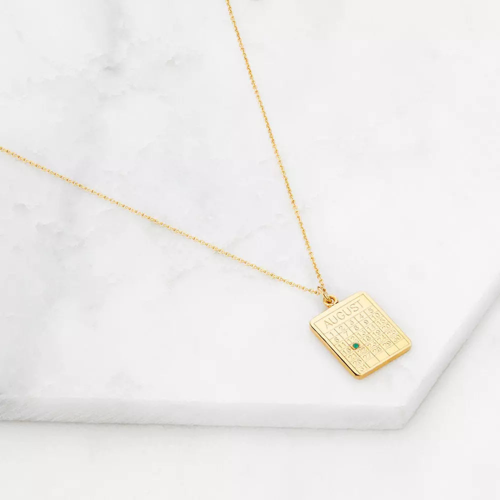 18ct gold-plated sterling silver with a custom-set gemstone. Choose from Genuine Diamond, White Crystal, and birthstones from January to December. Each gemstone is hand-selected and varies in size, shape, and translucency. The calendar is engraved to order, ensuring a unique design for every piece.