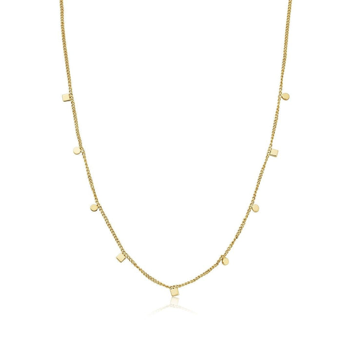 Available in solid sterling silver or gold plated sterling silver. Features a square and circle charm. Chain length: Adjustable 16-18 inches.