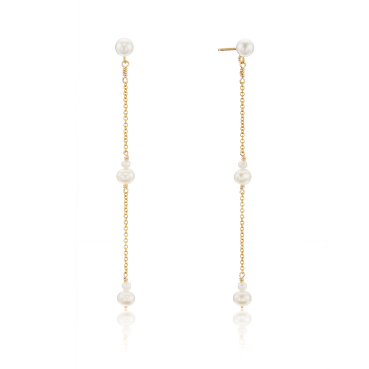These Gold Three Pearl Drop Earrings by Lily & Roo are a chic and sophisticated accessory that elevates any look. Handmade in our London studio with freshwater pearls and recycled precious metals, these earrings exude timeless beauty. The drop design adds movement, making them perfect for evening events or casual outings. Pair them with our single pearl choker to complete the ensemble.