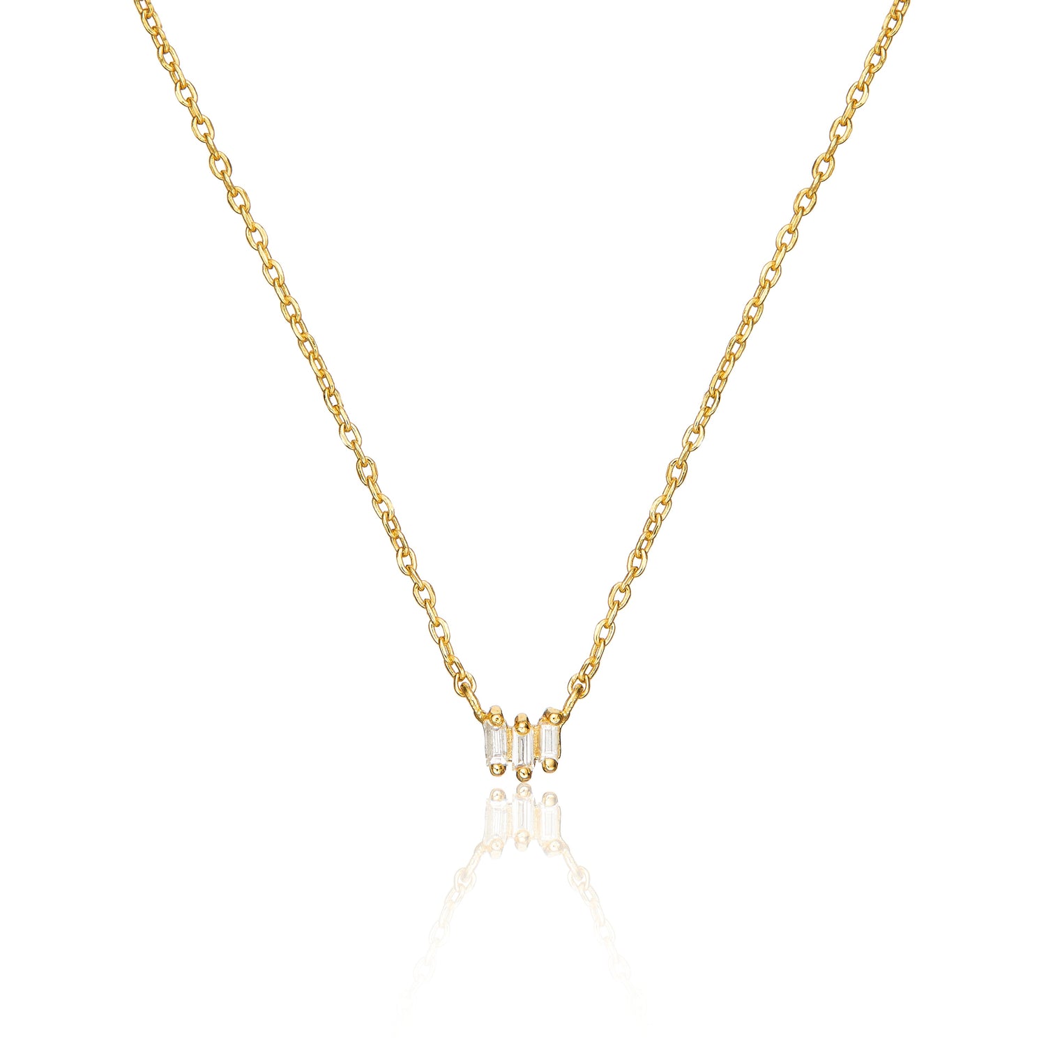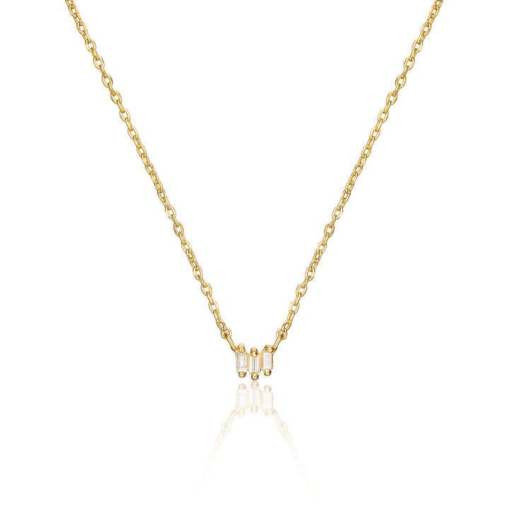 This Gold Triple Baguette Diamond Necklace by Lily & Roo adds a touch of elegance to any outfit. Featuring three pavé set diamonds or crystals, this necklace offers a refined sparkle that is perfect for both everyday wear and special occasions. Its timeless design ensures it will remain a cherished piece in any jewelry collection. Pair it with other pieces from the diamond-style baguette collection for a coordinated look.