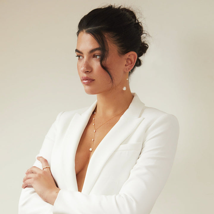 This Rose Gold Seed Pearl Lariat Necklace by Lily & Roo is a stunning bridal accessory, featuring a delicate arrangement of large and seed freshwater pearls. The lariat-style design offers a modern take on classic pearl jewelry, making it a perfect gift for weddings, anniversaries, or special occasions. Handmade in our London studio, this elegant piece is designed to be cherished.