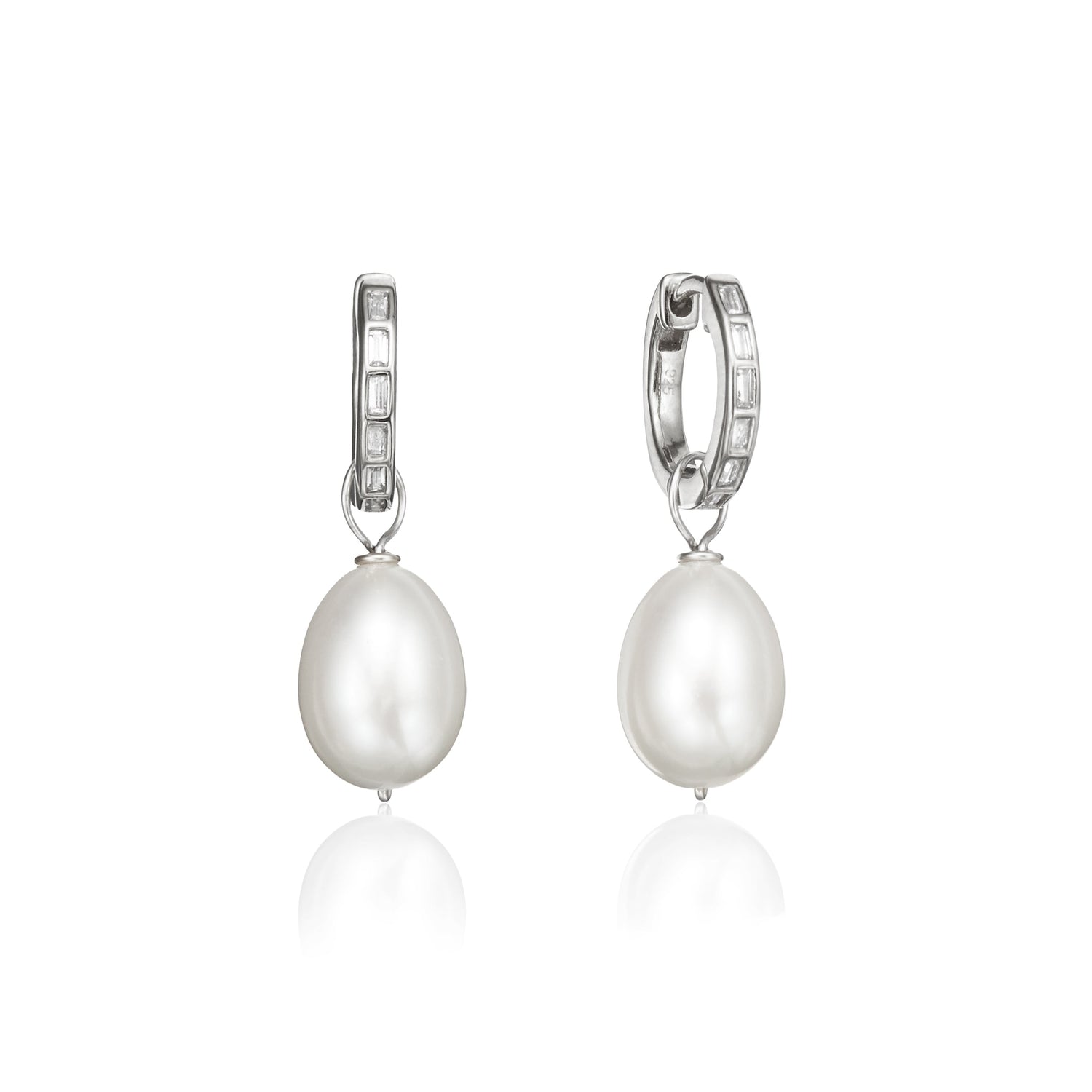 Silver Diamond Style Baguette Pearl Drop Hoop Earrings