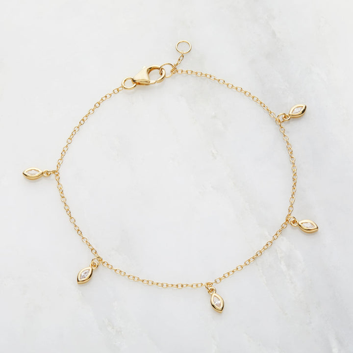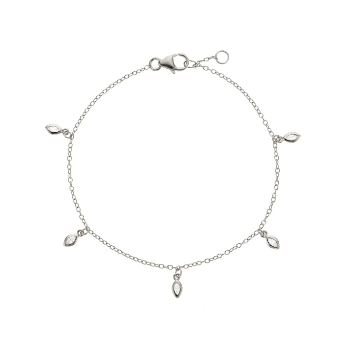 Crafted in solid sterling silver, featuring diamond-style marquise drops. Adjustable length: 17cm to 18cm.