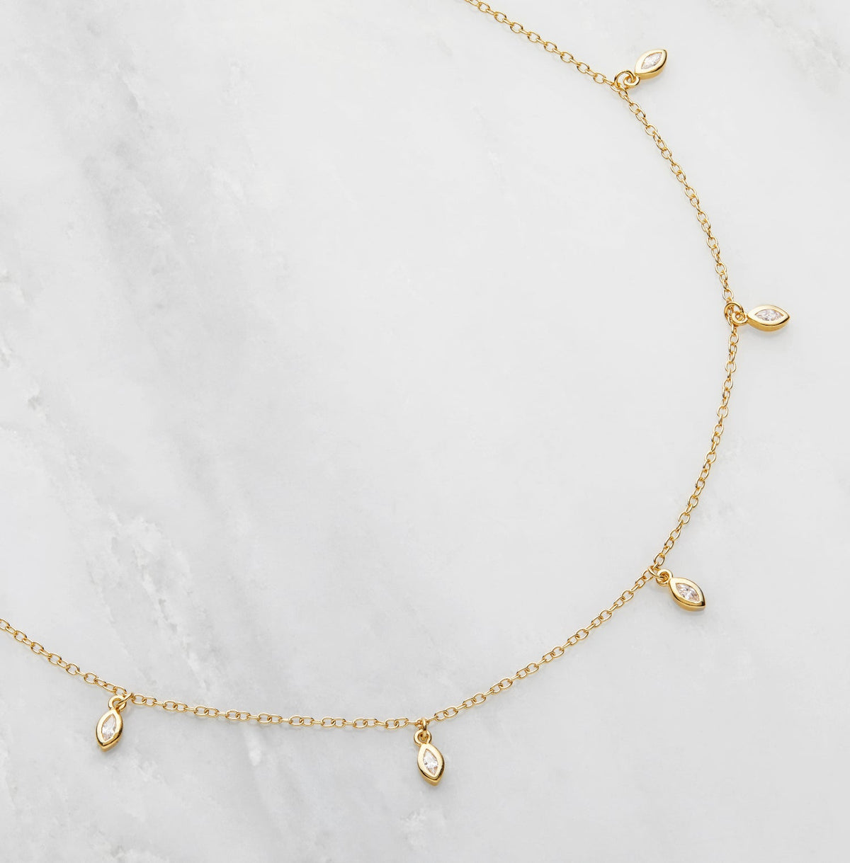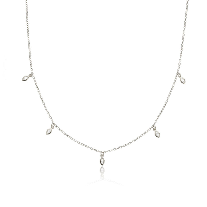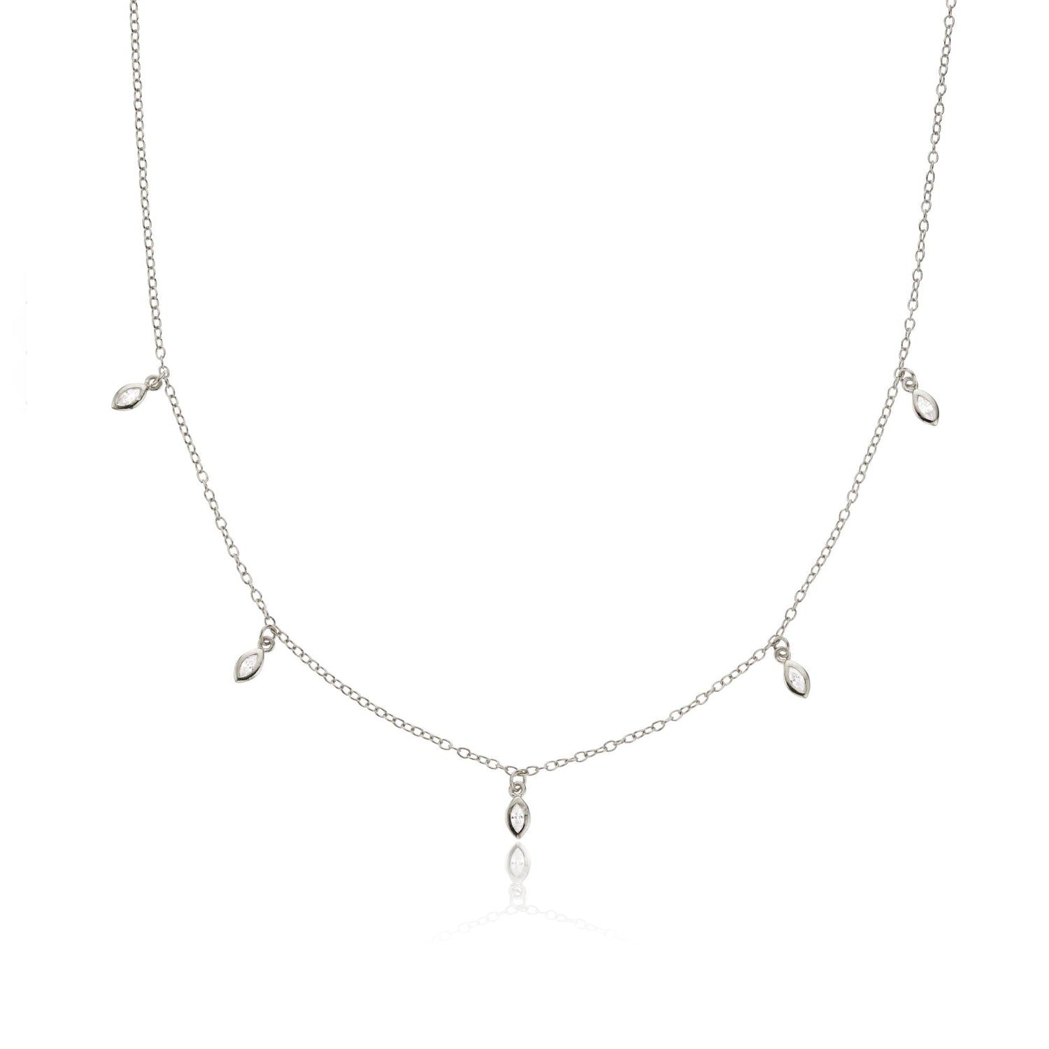 Made of solid sterling silver, featuring diamond-style marquise-shaped detailing. Adjustable extender loops for 15.5in, 16in, or 16.5in lengths.