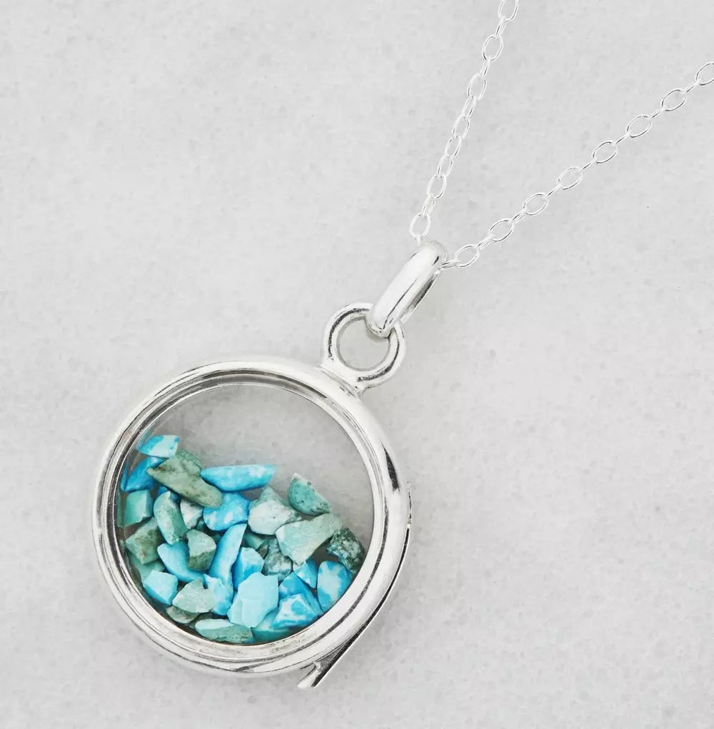 Solid sterling silver with a glass locket. Customizable with two hand-selected birthstones from January to December, as well as optional sterling silver letter charms. Each gemstone varies in size, color, and translucency for a unique finish.
