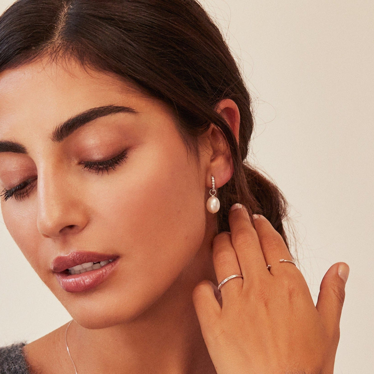 These Silver Huggie Pearl Drop Earrings by Lily & Roo are a beautiful blend of classic design and modern versatility. The huggie hoops delicately hug the earlobe, with removable pearls that allow for a more casual everyday look. Perfect for weddings, these earrings can transition effortlessly from day to night.