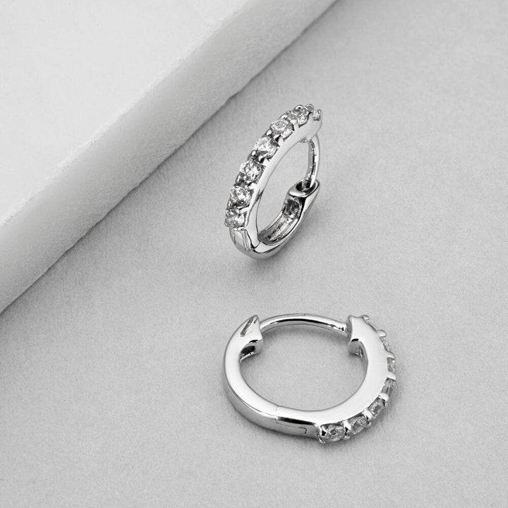 Solid sterling silver huggie hoops with removable freshwater pearls. Available in gold-filled, rose gold-filled, and solid gold.