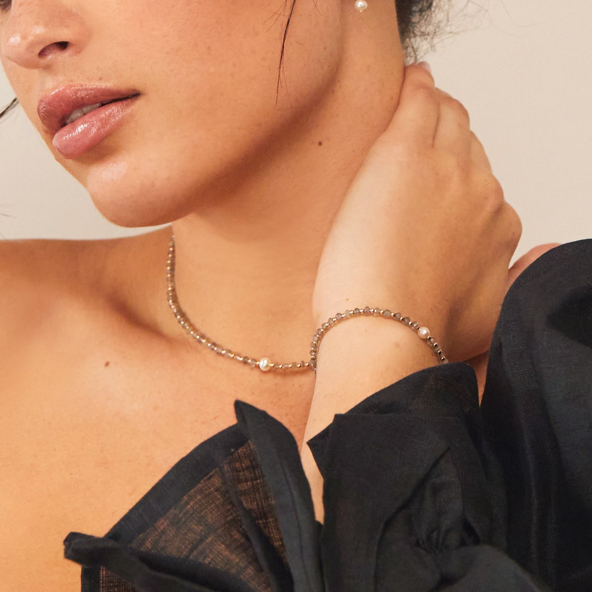 Solid sterling silver beads, featuring labradorite gemstones and a freshwater pearl. Also available in gold-filled finishes.