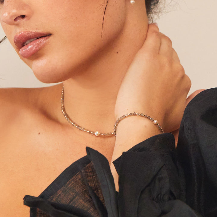 This Silver Labradorite Gemstone Choker by Lily & Roo is an ethereal and eye-catching piece, handcrafted using labradorite gemstone chips and solid sterling silver beads. The iridescent glow of labradorite adds a mystical charm, while a freshwater pearl accent enhances its elegance. Wear alone for a statement look or layer with other necklaces for a stylishly stacked appearance.